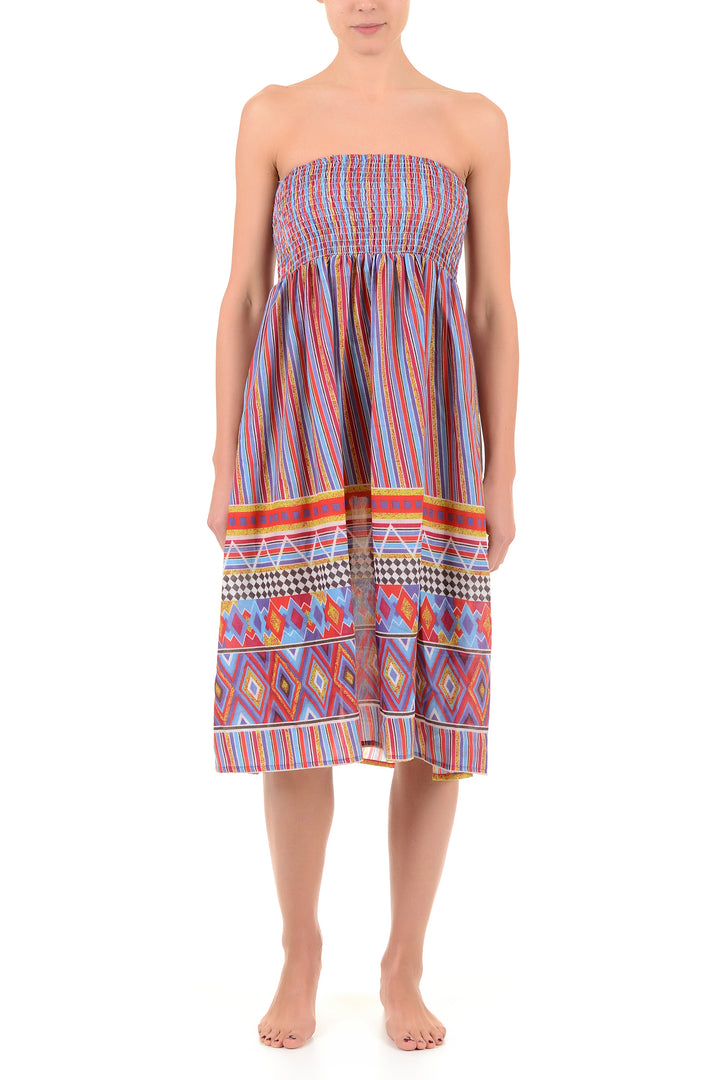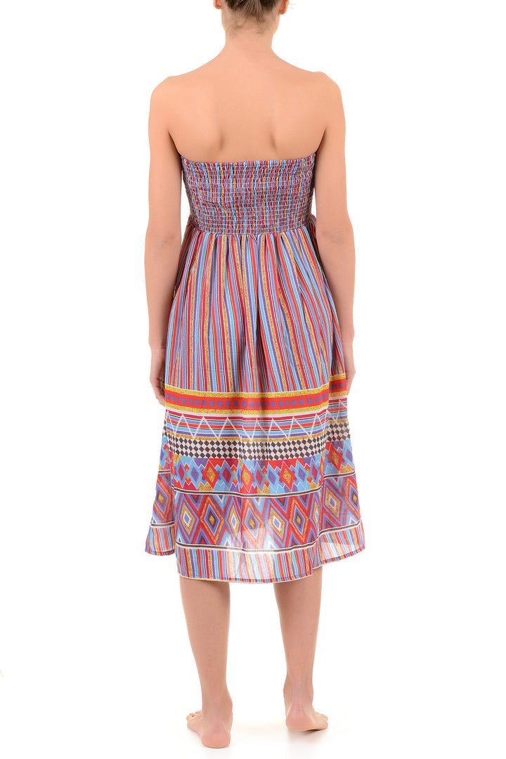 This elegant dress features an elasticized bandeau bodice that ensures a comfortable and secure fit. Made from a silk blend, the fabric offers a soft and breathable feel with a refined texture. The distinctive pattern adds a sophisticated touch, making it perfect for elegant occasions where comfort and style meet.