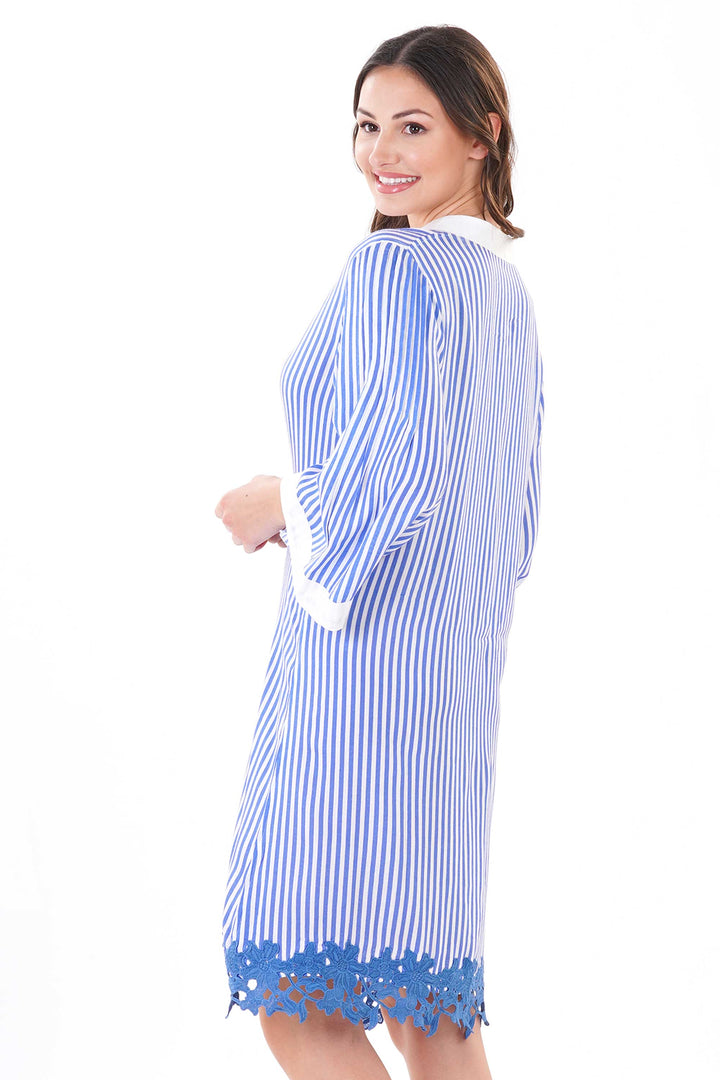 Elegant striped dress with a sophisticated 3/4 sleeve design. The silhouette is enhanced by delicate embroidered flowers applied at the hem and refined lace details. A distinctive piece that combines the classic aesthetic of stripes with handcrafted decorative elements typical of Italian tradition.