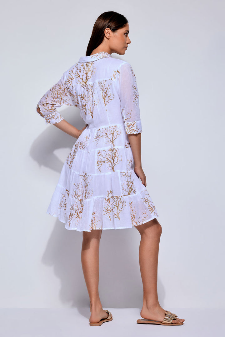 Dress in pure cotton with a fresh coral print. The shirt collar and 3/4 sleeves add a refined touch, while the ruffled hem gives a delicate movement. Perfect for a summer and sophisticated look.