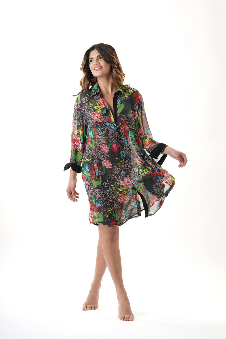 This shirt dress with a charming floral pattern is perfect for summer days. The classic cut of the shirt guarantees comfort and versatility, allowing you to easily transition from the beach to a casual dinner. The structured details and the quality of the materials reflect the typical elegance of Italian coastal style. An essential garment that combines practicality and refinement.