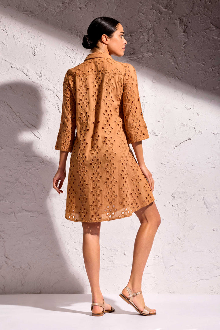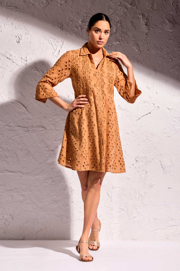 The Clori shirt dress with 3/4 sleeves is perfect for a casual yet elegant look. This versatile piece is made of pure cotton, ensuring a breathable and comfortable fabric. The buttons at the front and on the sleeves and the lace add a touch of style. Ideal for summer.