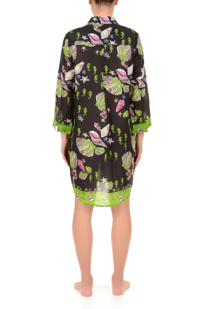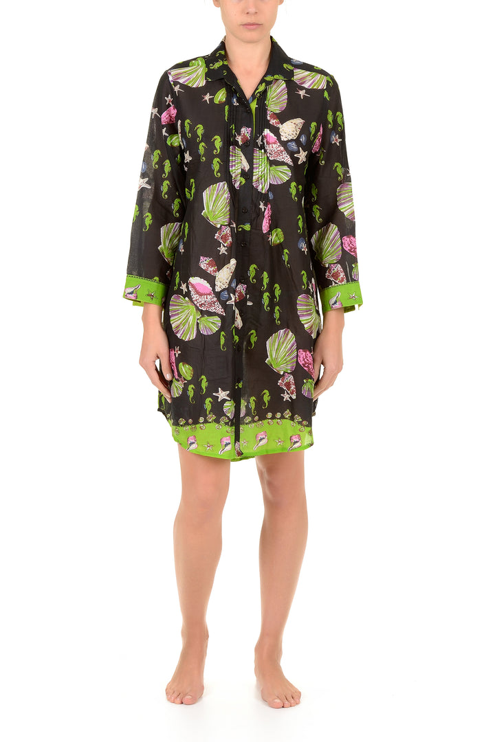 This cotton shirt dress features an elegant front button closure that makes it easy to wear. The marine pattern with shells makes it perfect for a refined and fresh summer look. Ideal for those seeking comfort without sacrificing style.