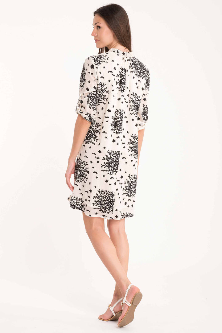 The coral shirt dress in pure cotton combines the structural simplicity of a shirt with the elegance of a complete dress, perfect for those seeking comfort without stylistic compromises. The cotton fabric ensures breathability and softness on the skin, ideal for the warm season. The coral pattern adds character and movement to the design, making it suitable for both casual and semi-formal occasions.
