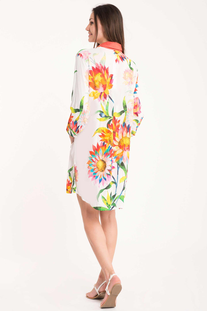 This shirt dress with a charming floral pattern features a front button closure that allows versatile styling options, whether worn fully closed or open as a swimsuit cover-up. The practical side pockets offer functionality without compromising aesthetics. Perfect for summer days at the beach or for a walk in the city.