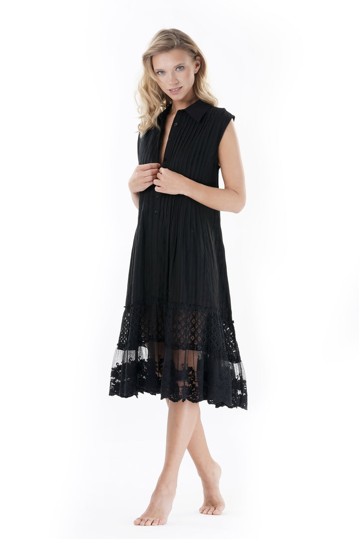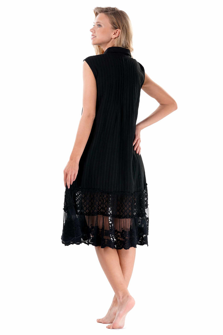 This sleeveless shirt dress features elegant Sangallo lace details, made from pure cotton to ensure exceptional breathability and comfort. Its refined design combines classic shirt elements with delicate lace details, making it a sophisticated choice for summer occasions. The high-quality cotton ensures softness and durability, while the lace adds a subtle touch of femininity and texture.