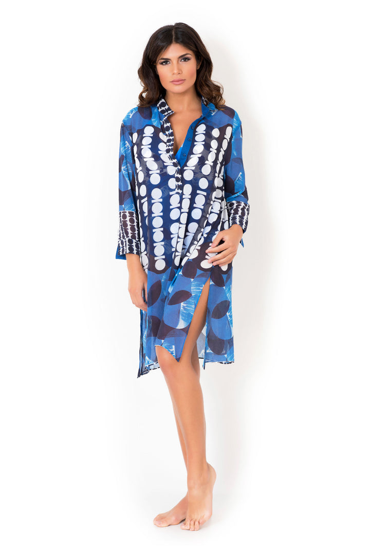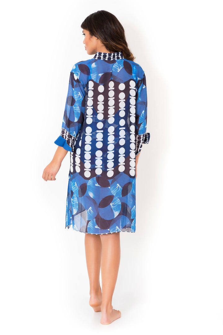 The Isabella shirt dress with a contemporary silhouette features elegant side slits that ensure freedom of movement. The pattern in blue tones gives depth and versatility to the garment, making it ideal for seasonal transitions. Perfect for those seeking a balance between comfort and refinement, this piece stands out for its ability to adapt to multiple occasions, from casual to semi-formal.