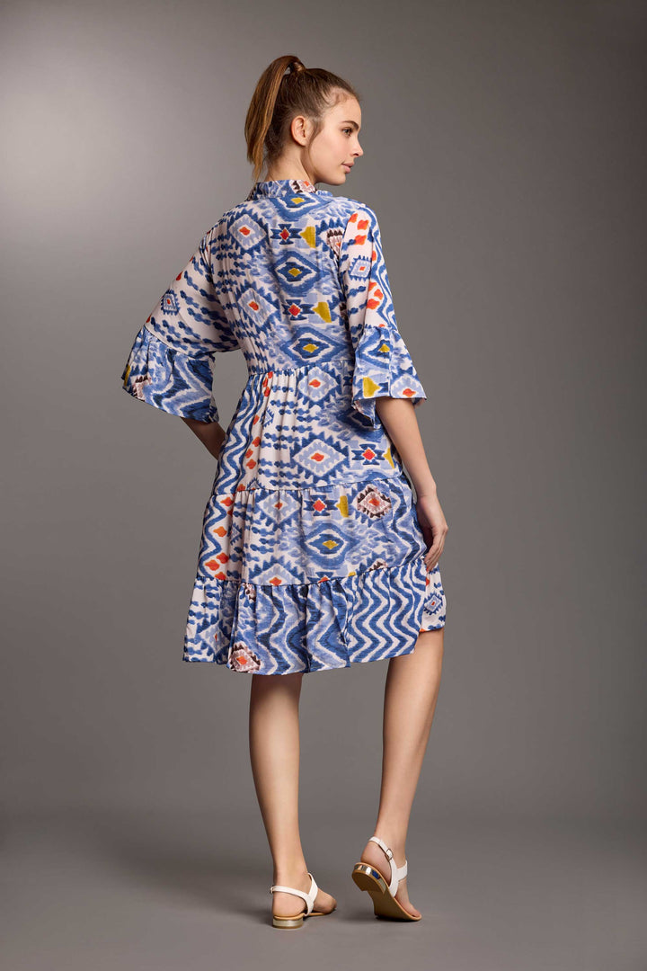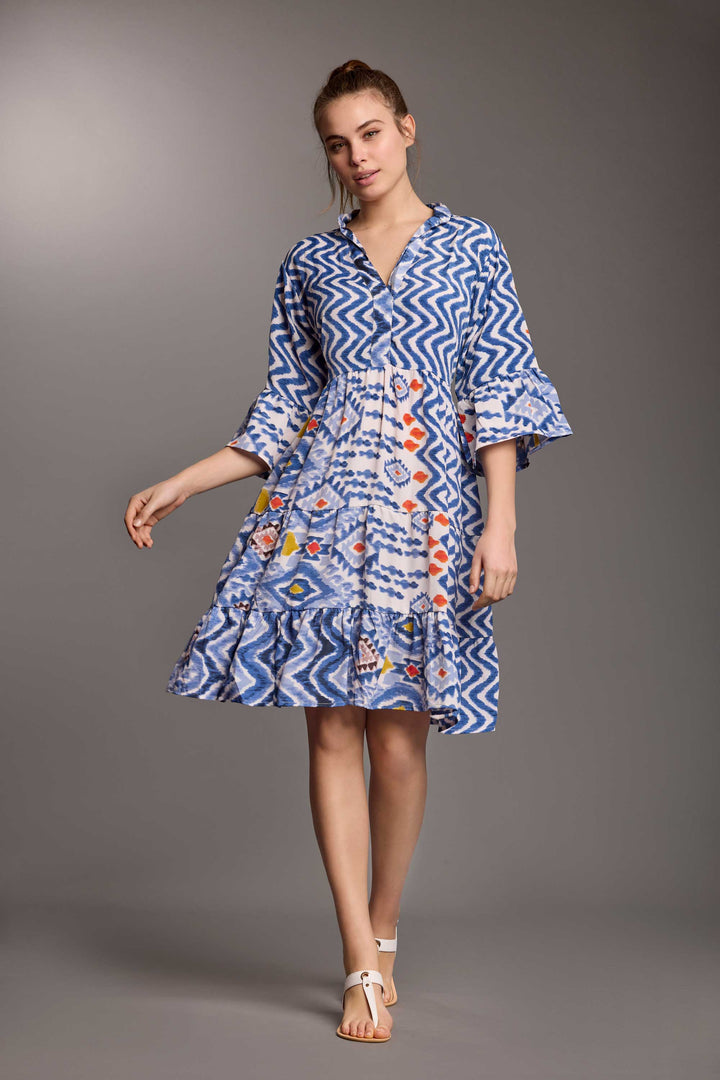 The Lizzie shirt dress is ideal for a refined and elegant look. Its 3/4 sleeves with ruffles, V-neckline, and sophisticated floral print add a touch of luxury to your summer outfit. Made from shiny fabric and featuring a skirt with ruffles, it is perfect for those seeking a sophisticated look.