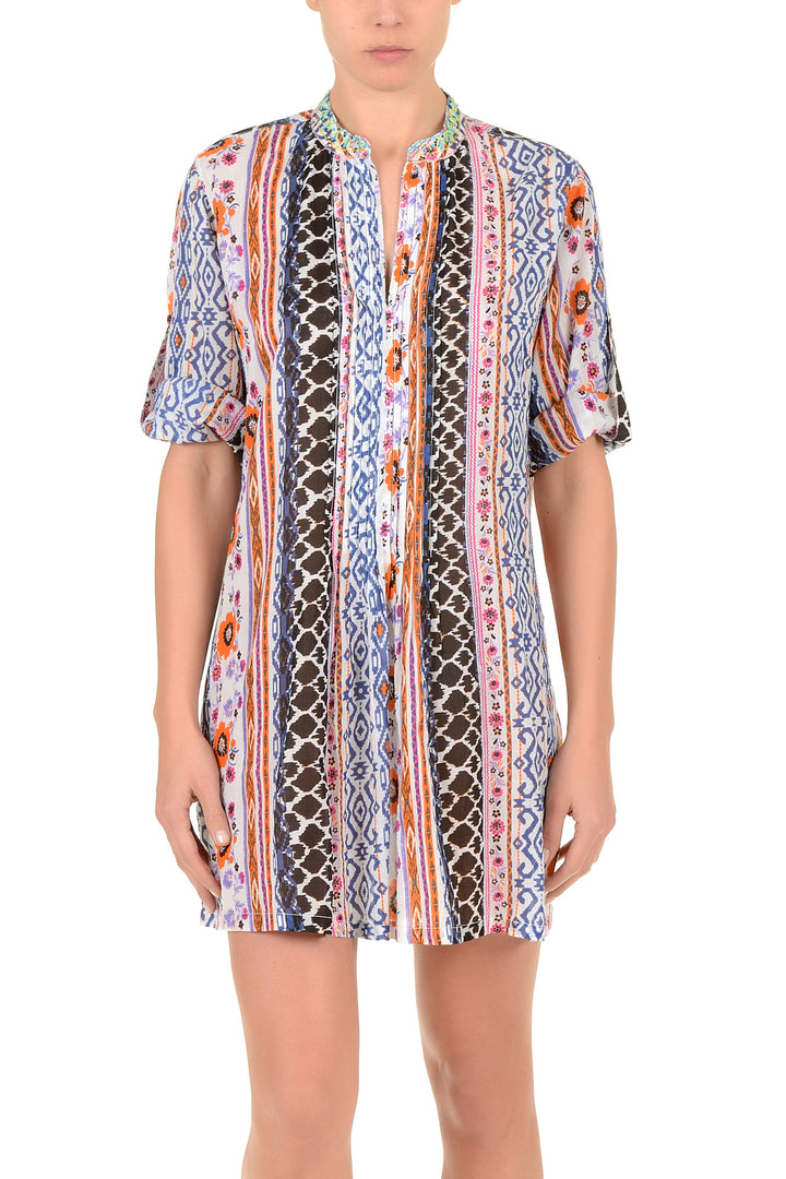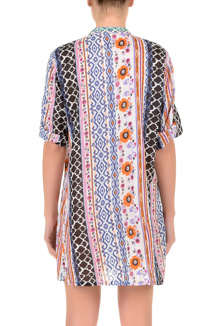 The Sarah shirt dress in pure cotton with a charming ethnic pattern combines comfort and style, perfect for those seeking conscious elegance. The cotton ensures breathability and softness on the skin, while the design inspired by ethnic motifs gives character and personality. Ideal for casual and semi-formal occasions, it pairs easily with minimal accessories for a refined and contemporary look.
