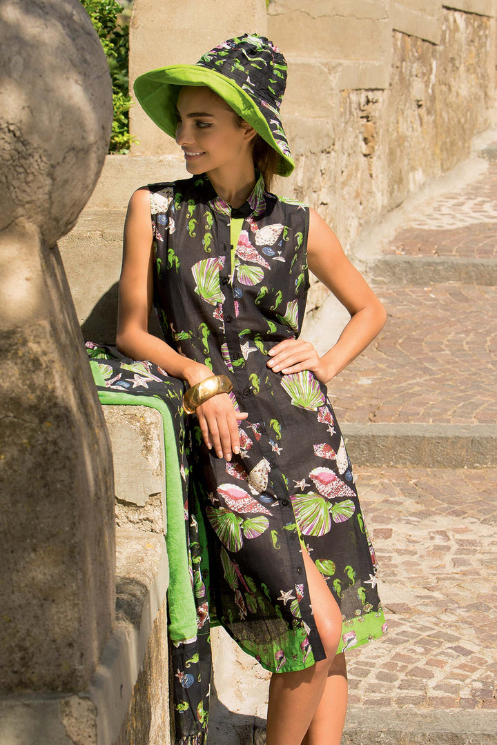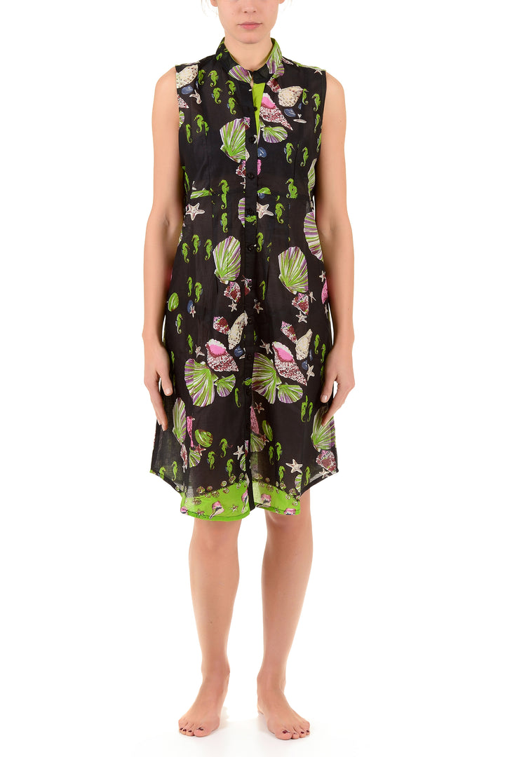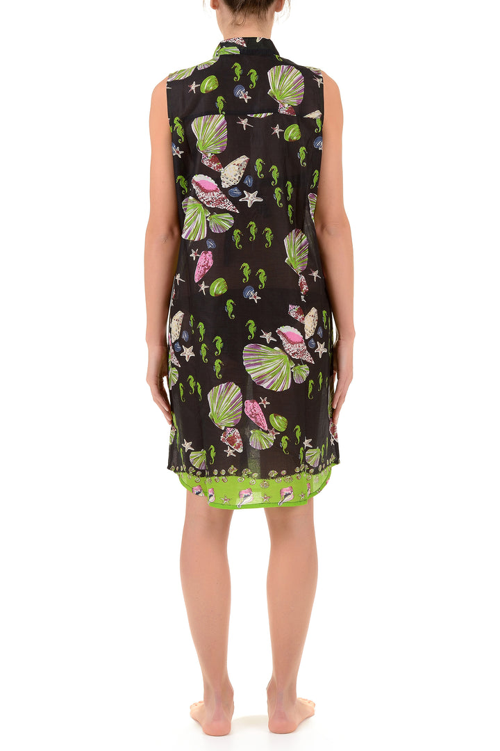 The sleeveless Alba shirt dress in pure cotton with front buttoning is perfect for summer days. The pattern depicting shells and seahorses captures the essence of coastal style, ideal for those looking for a versatile and refined garment. The sleeveless silhouette ensures freedom of movement and freshness, while the marine details add a touch of nautical elegance.