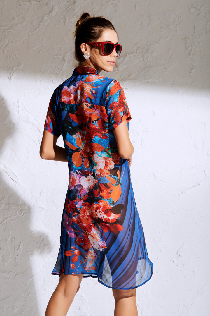 Dress shirt in sheer fabric with half sleeves and classic neckline, perfect for seasonal transitions. The structured silhouette stops at the knee, ensuring effortless elegance. Ideal for those looking for a versatile piece that easily transitions from day to night, maintaining a refined and contemporary aesthetic.