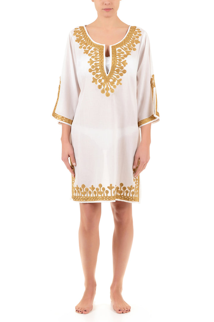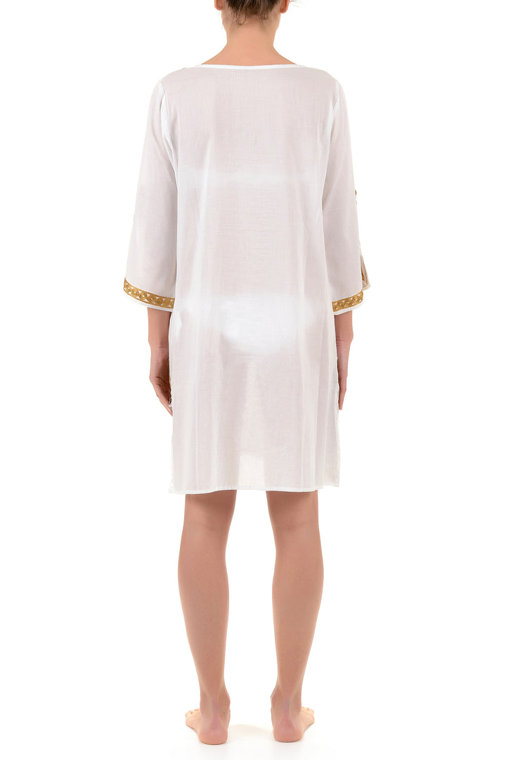 This white dress stands out for the refined embroidery on the neckline, sleeves, and hem, which enhances its elegance. Ideal for those looking for a sophisticated and classy garment, it combines a clean design with artisanal details, perfect for special occasions or formal events.