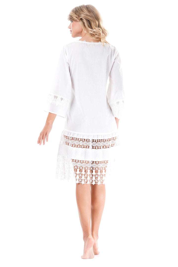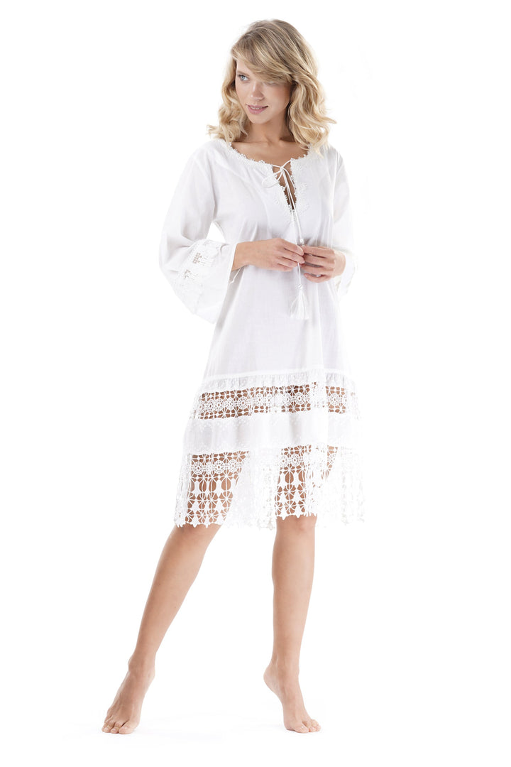 This dress in a cotton and silk blend combines comfort and refinement thanks to the delicate fabric that ensures lightness and breathability. The tie with tassels adds a touch of discreet elegance, while the lace details embellish the design with artisanal finesse, making it ideal for those seeking a sophisticated style without sacrificing comfort.