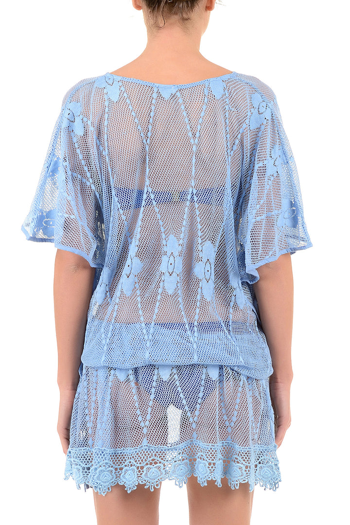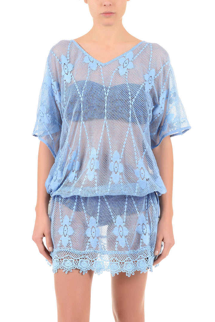 Questo abito in puro cotone unisce comfort e raffinatezza grazie allo scollo a V e ai dettagli in pizzo e trasparenze. La tonalità azzurro dona freschezza e versatilità, perfetta per un look elegante e distintivo. Un capo ideale per chi cerca eleganza senza rinunciare alla qualità dei materiali.