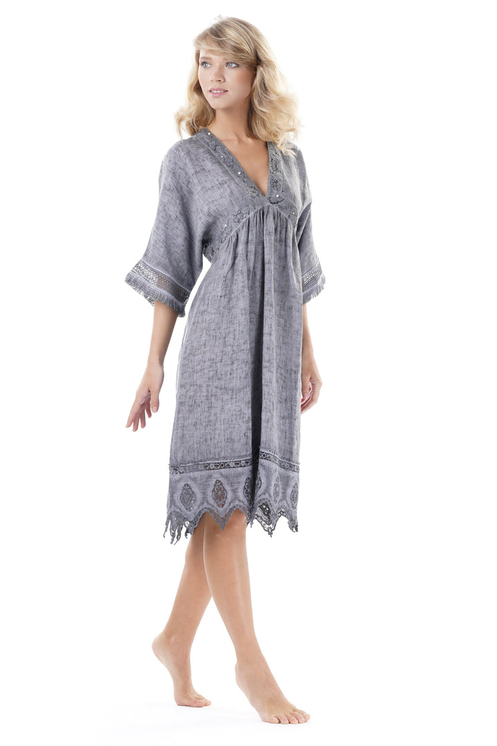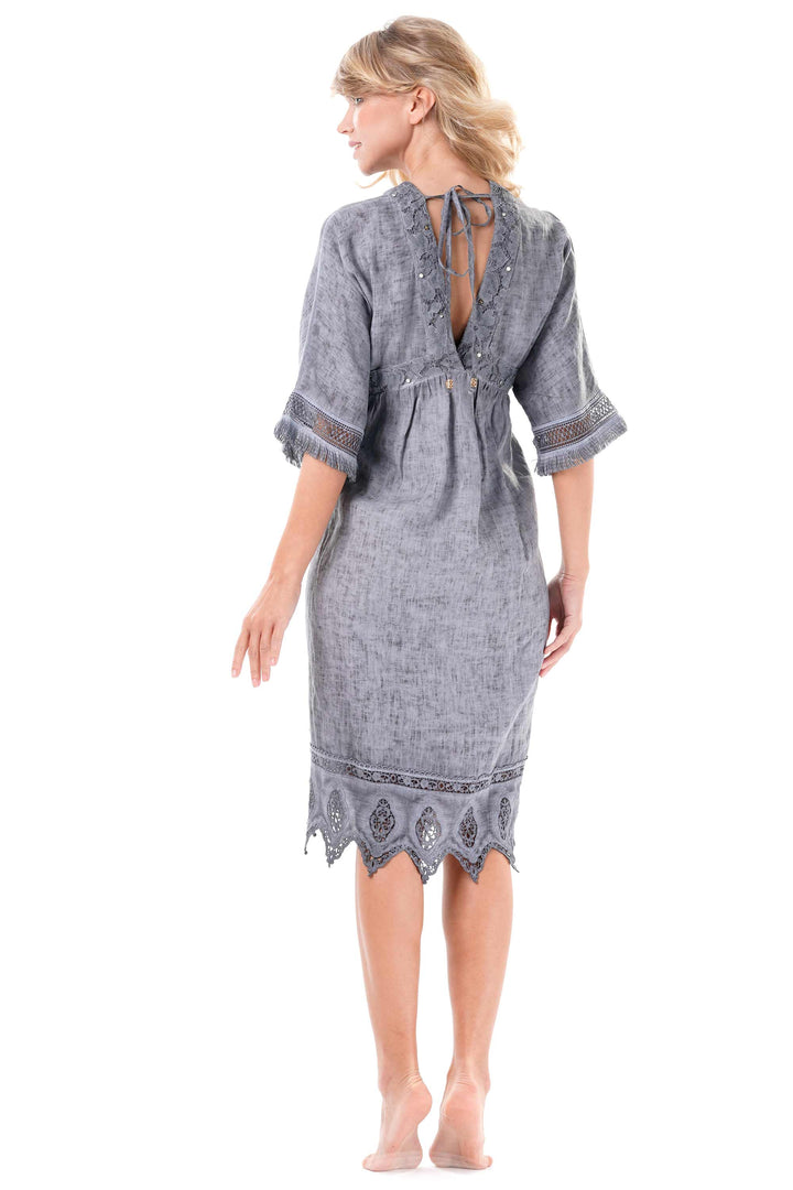 This dress, made of pure cotton, guarantees comfort and breathability all day long. The V-neck enhances the silhouette with elegance, while the lace details add a refined and sophisticated touch. An ideal garment for those who seek quality and style without giving up the pleasantness of natural fabric.