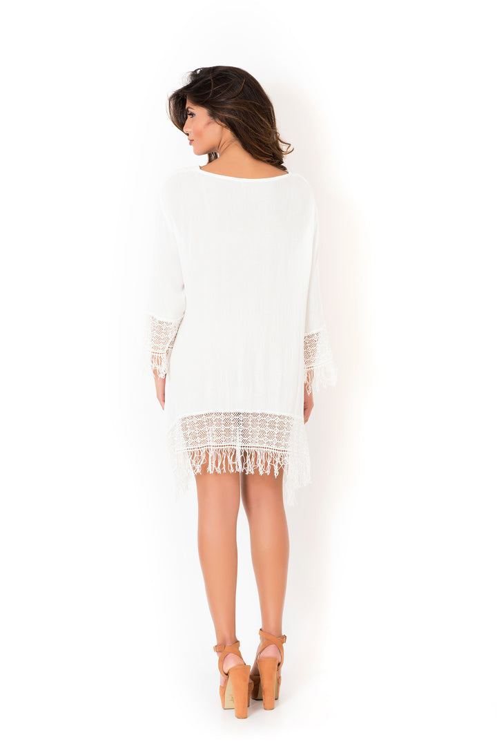 This elegant white dress features a flattering V-neckline and delicate fringe details on the hem and sleeves. Refined lace inserts, combined with thin transparent panels, add a touch of class, perfect for sophisticated occasions. The design balances classic elements with modern transparency, creating a distinctive and refined style.