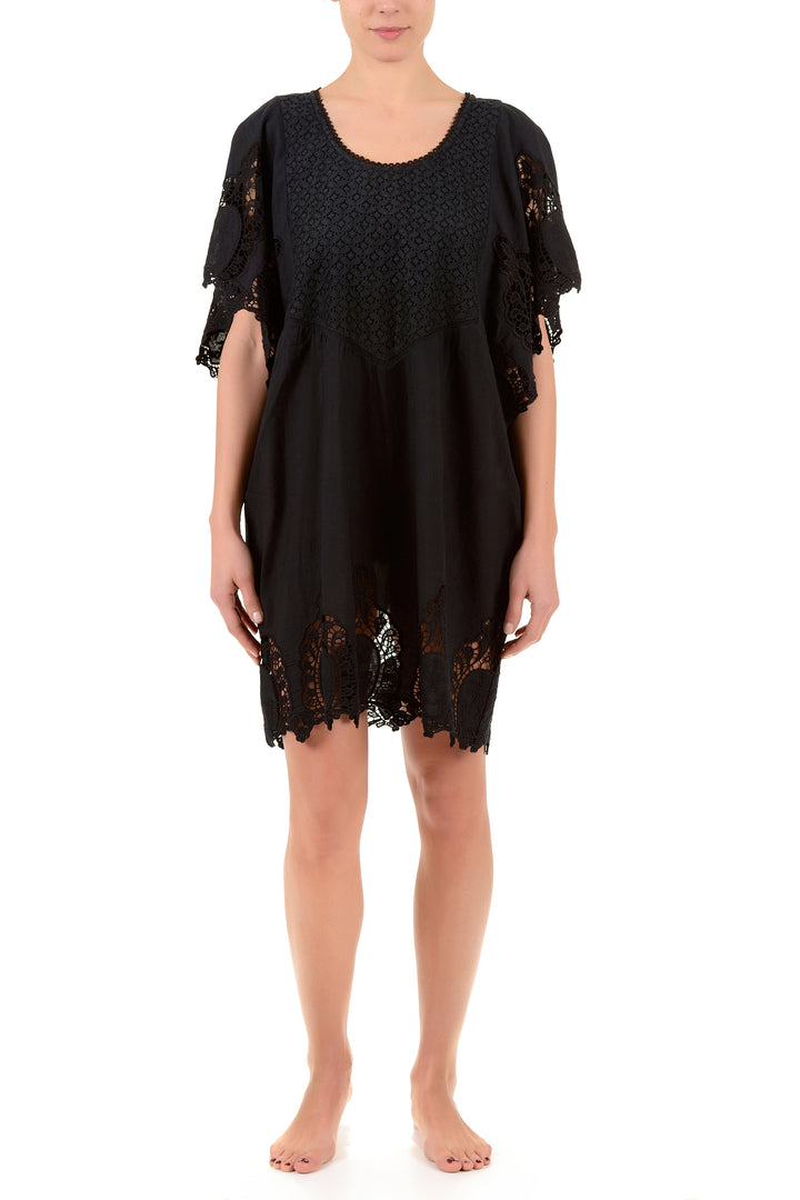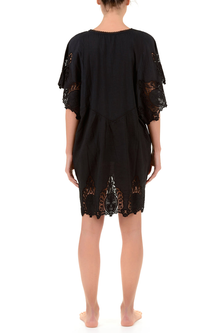 This elegant dress, made of pure cotton, offers breathability and comfort. The delicate lace inserts on the sleeves and hem add a touch of refinement, while the classic round neckline gives a timeless silhouette. The black color enhances its versatility, making it suitable for both day and evening.