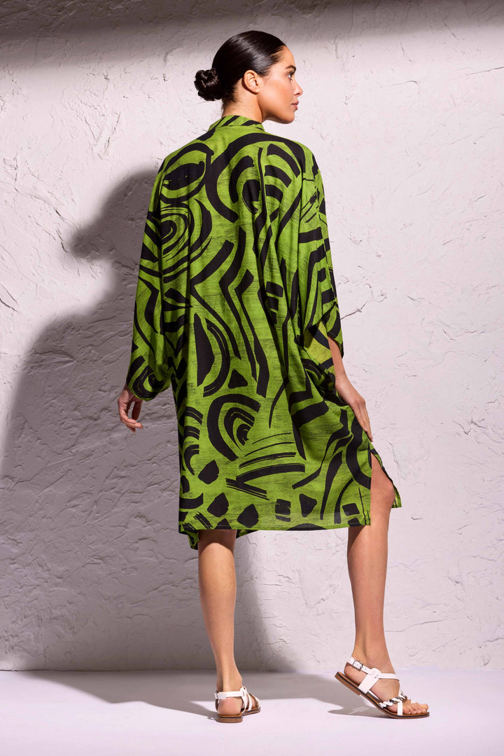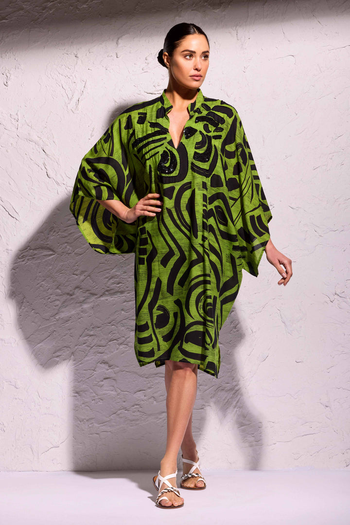 L'abito Flor è l'ideale per giornate calde e vacanze. Grazie al suo design rilassato, alle maniche a pipistrello e alla lunghezza mini, offre un look ampio e confortevole. Non solo estetica, ma anche funzionalità per essere fresche e comode durante le giornate più calde.
