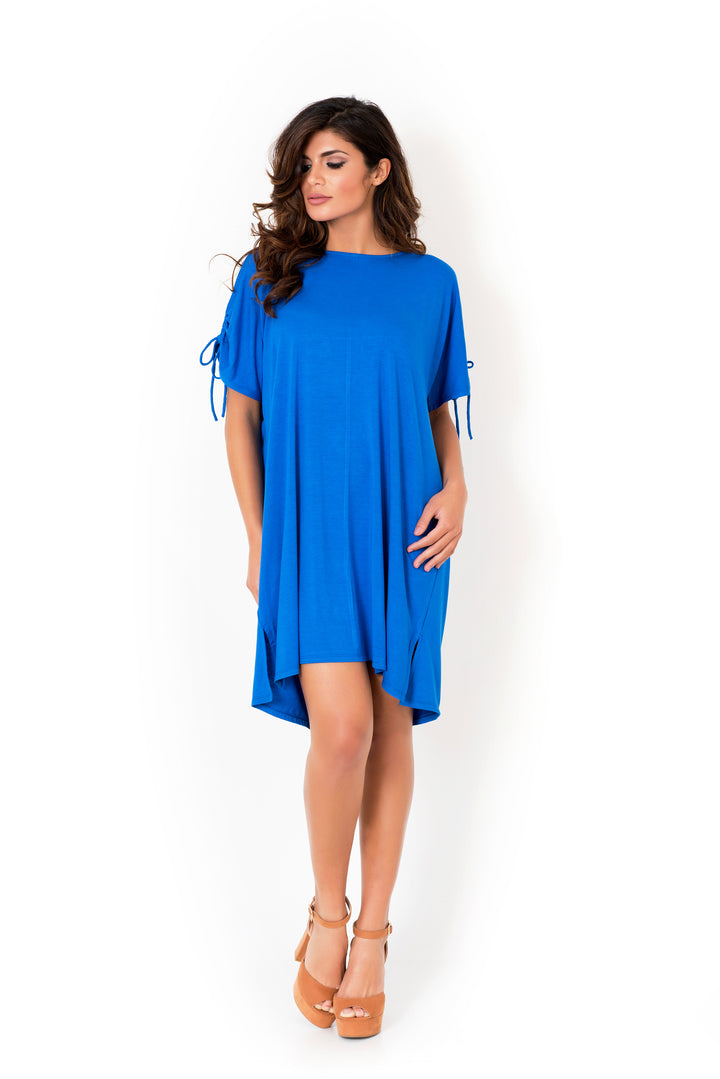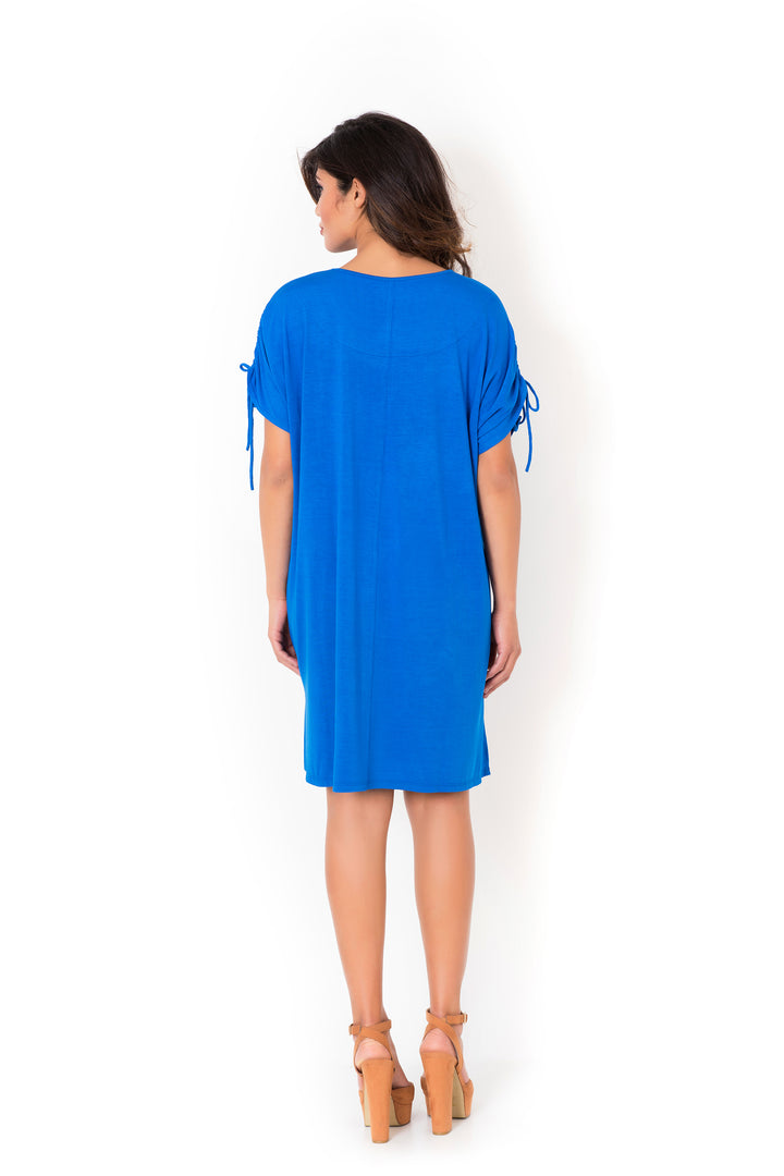 This elegant dress features adjustable drawstrings on the sleeves, allowing for a customized fit and greater style versatility. Carefully crafted with attention to detail, it combines comfort and sophistication, making it an excellent choice for various occasions.
