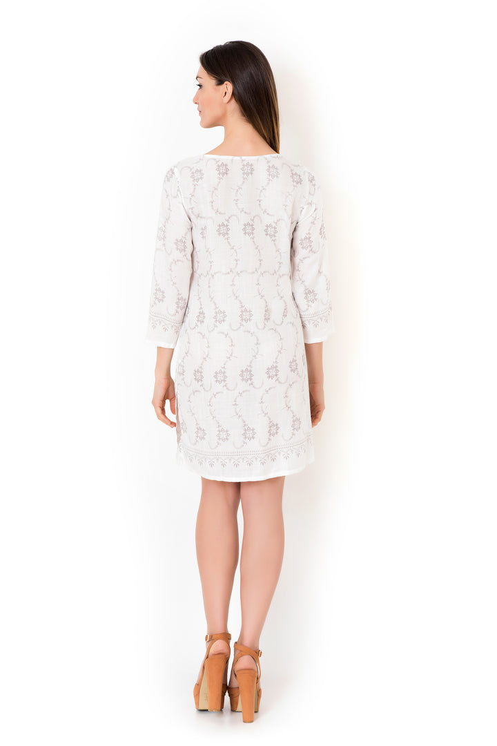 Realizzato in puro cotone, questo abito bianco combina comfort e raffinatezza grazie ai delicati ricami a fiori. Lo scollo a V enfatizza la silhouette con eleganza, rendendolo perfetto per chi cerca un capo leggero e sofisticato, ideale per le giornate calde o occasioni informali.