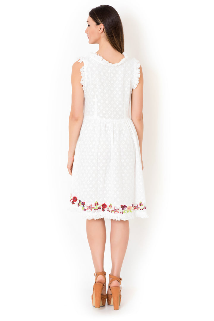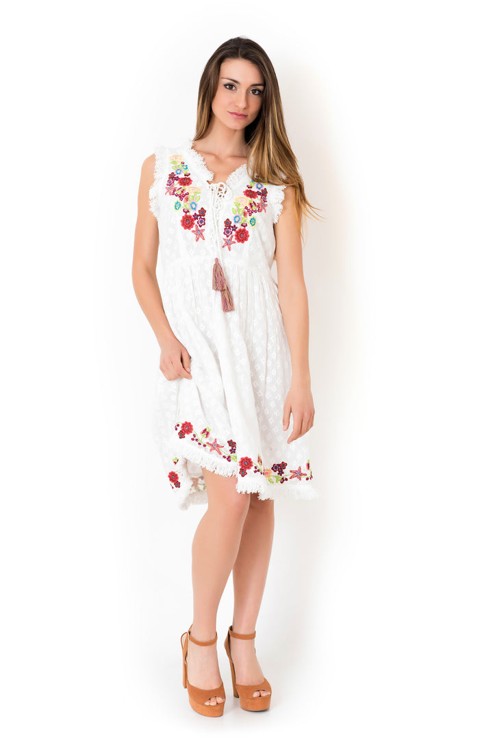 This sleeveless dress combines elegance and handcrafted details with fringes on the hem that add a touch of sophisticated movement. The floral embroidery embellishes the fabric, enhancing the silhouette with a refined and distinctive design, ideal for those looking for a unique garment carefully crafted in every detail.