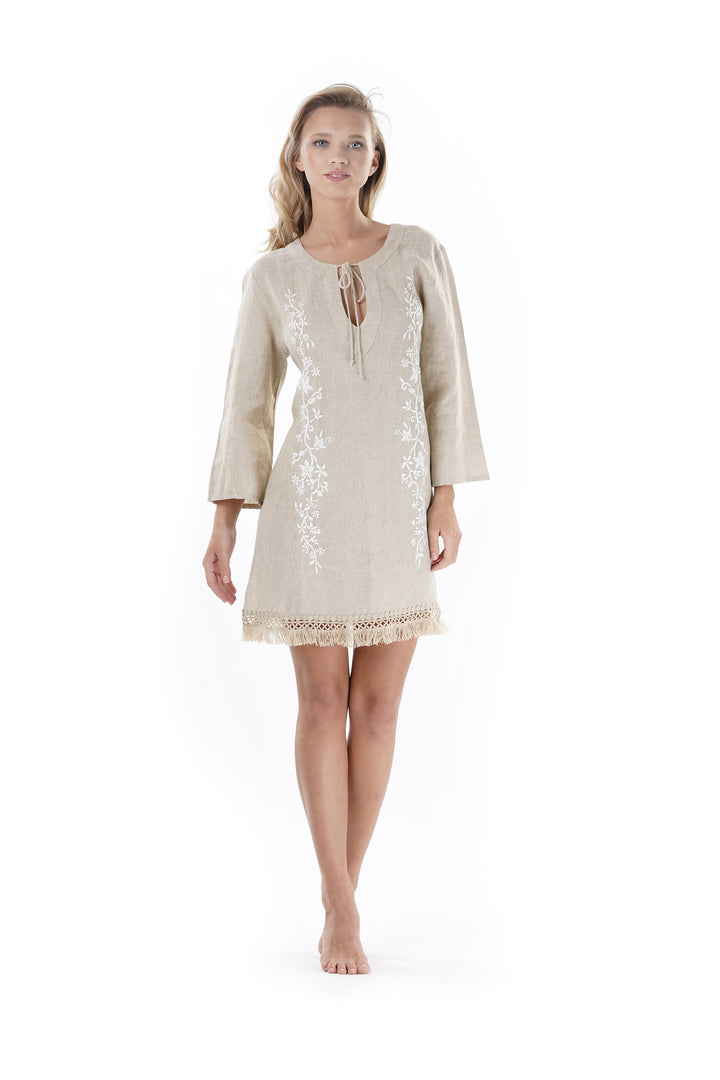 This dress made of fine linen blend is ideal for the warm season thanks to the natural breathability of the fabric. Characterized by elegant fringes on the hem that give a touch of movement and refinement. A versatile garment that combines comfort and style, perfect for casual and semi-formal occasions with a contemporary aesthetic.