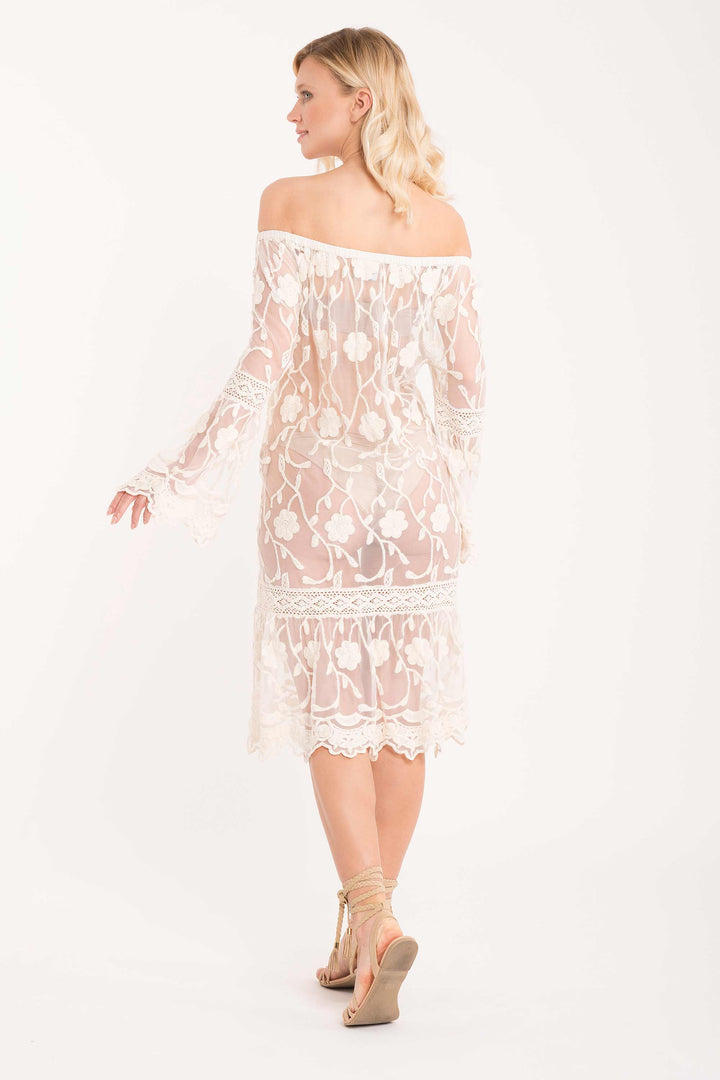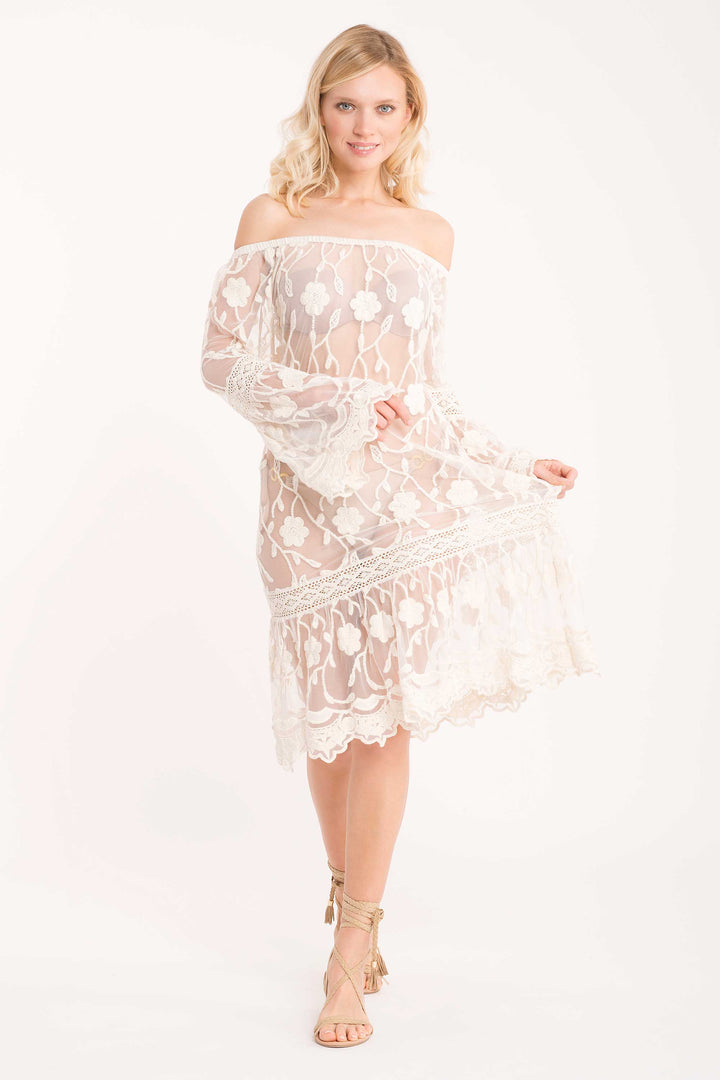 This elegant dress features refined macramé lace details that add a touch of sophistication. The lace inserts combined with transparent areas create a fascinating play of light and shadow, delicately enhancing the silhouette. A versatile garment that combines femininity and contemporary style, perfect for special occasions where you want to stand out with uncompromising elegance.