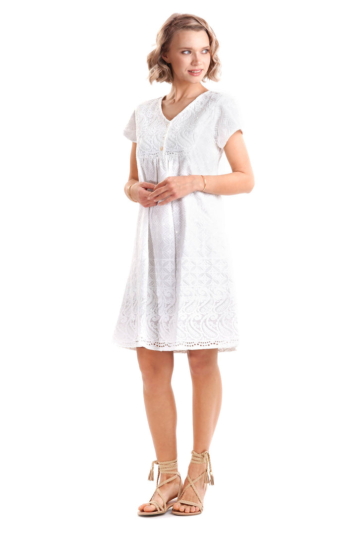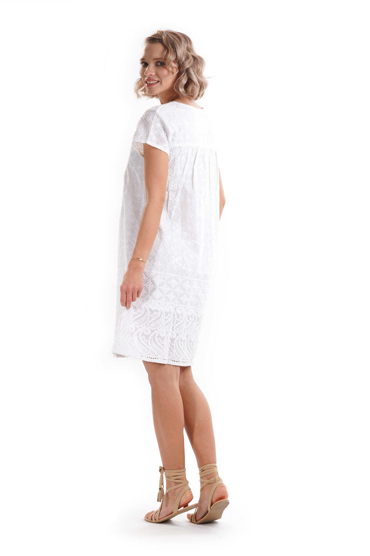 The Isla dress in pure cotton with lace details features an elegant and versatile cut. The half sleeves ensure comfort and practicality, making it ideal for transitional seasons. The quality of the fabric guarantees breathability and softness on the skin, while the lace details add a touch of refinement. An essential garment that combines simplicity and style, perfect for casual and semi-formal occasions.