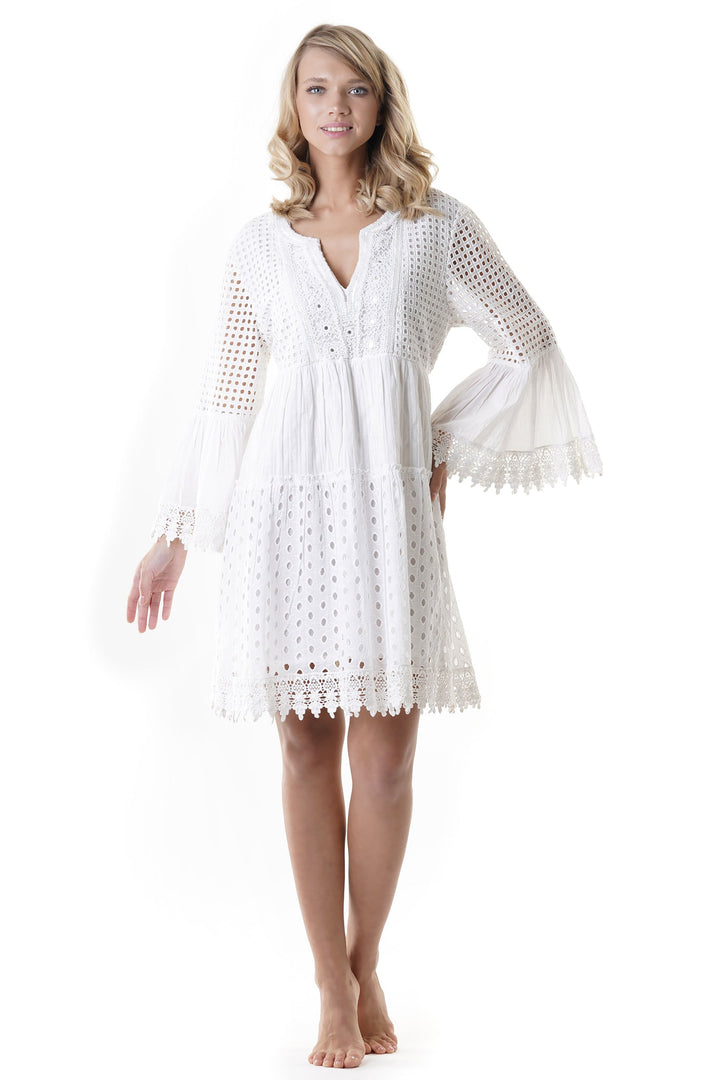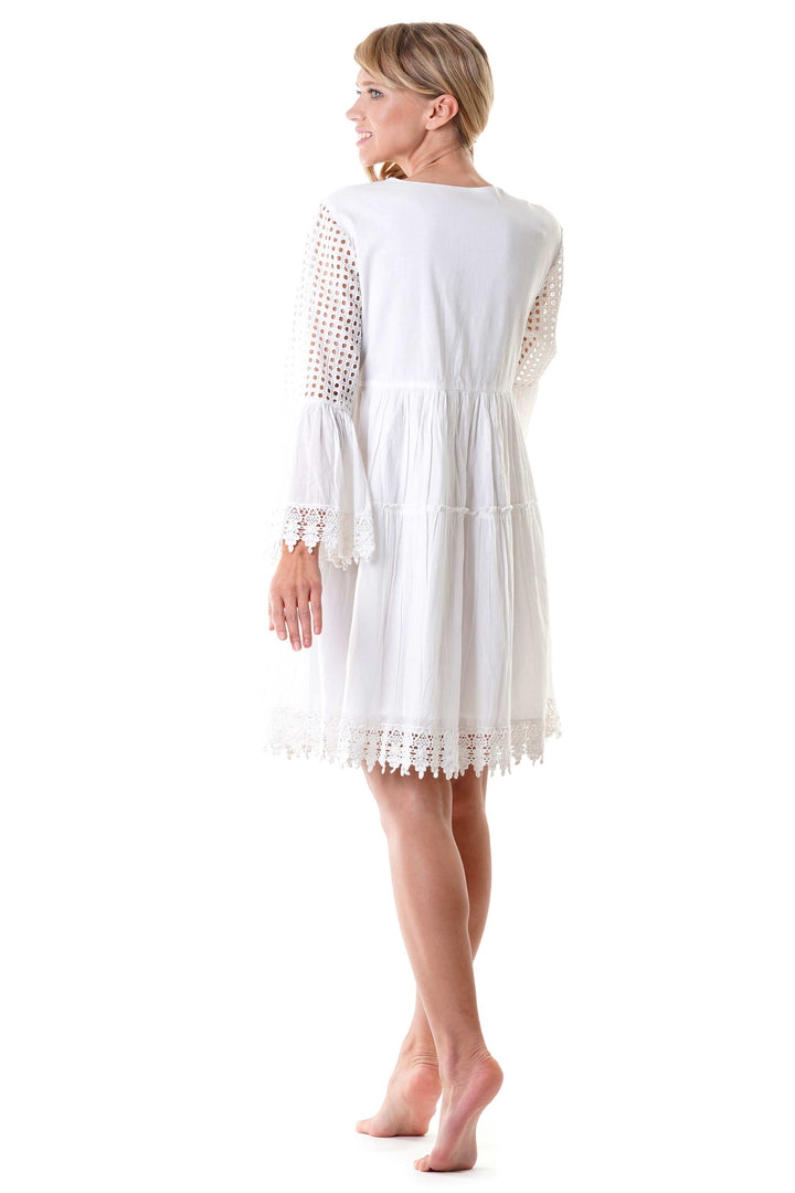 This dress features wide sleeves and delicate Sangallo lace details, made from pure cotton. The breathable fabric ensures comfort, while the lace adds an elegant and refined touch, making it ideal for a sophisticated yet comfortable look.