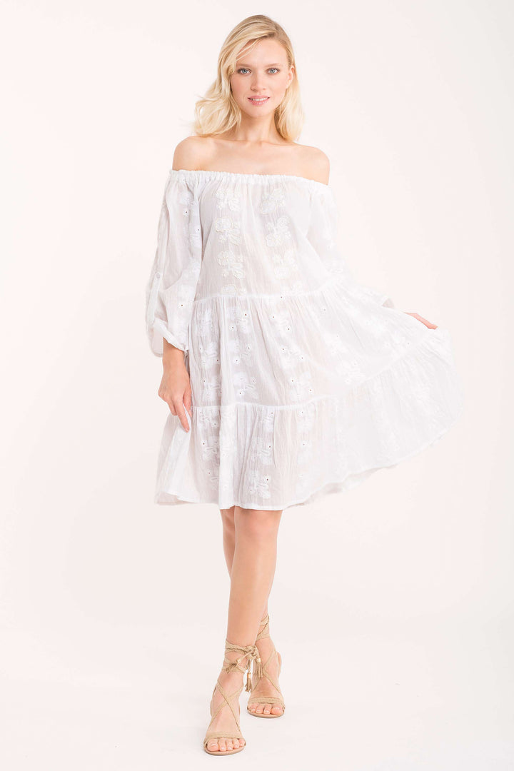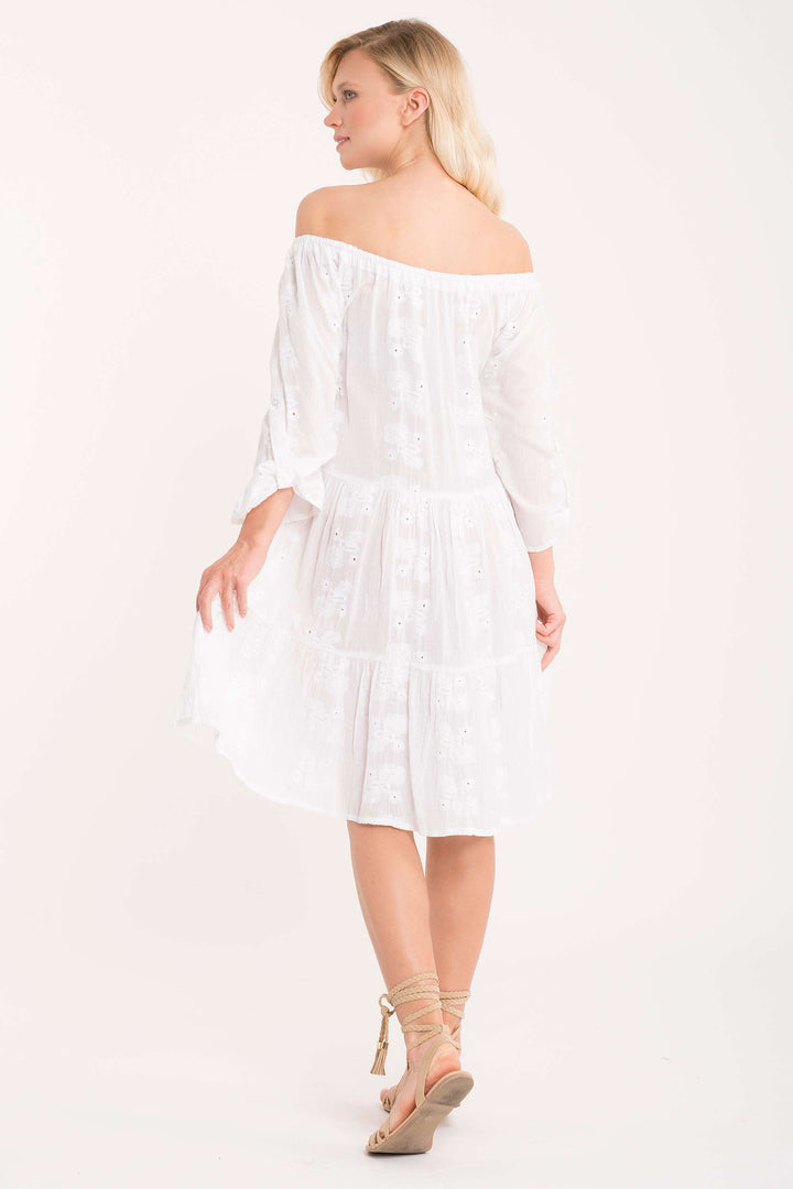 This elegant dress in pure cotton with a refined boat neckline, embellished with Sangallo lace details, represents a versatile garment that stands out for its construction quality and attention to detail, perfect for occasions that require discreet and conscious elegance.