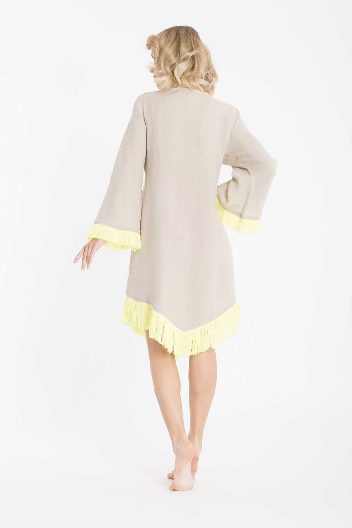 Dress in pure linen, with long sleeves and ethnic embroidery that adds a touch of tradition and style. The fringes along the hem and the adjustable neckline with ties give it a boho-chic look, perfect for summer and versatile wear. Its lightness and unique details make it ideal for a relaxed yet refined look.
