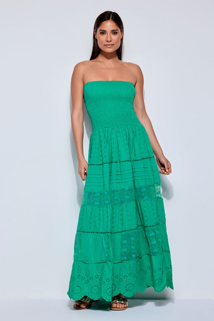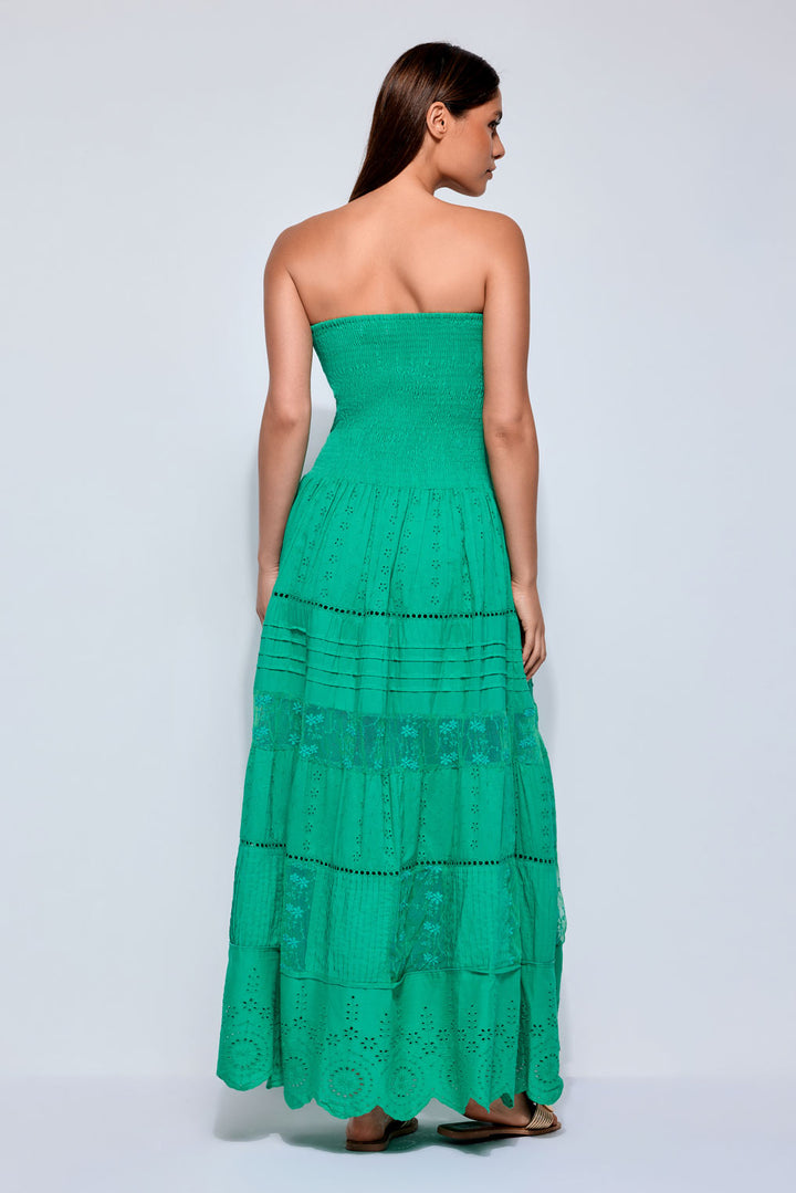 Grab attention with the long dress with a ruffled skirt and elasticated bandeau bust. The pure cotton fabric and the tulle and lace inserts make this dress unique and precious. For an even more special touch, the Sangallo lace bottom is hand embroidered. Have fun with this unique and original garment!