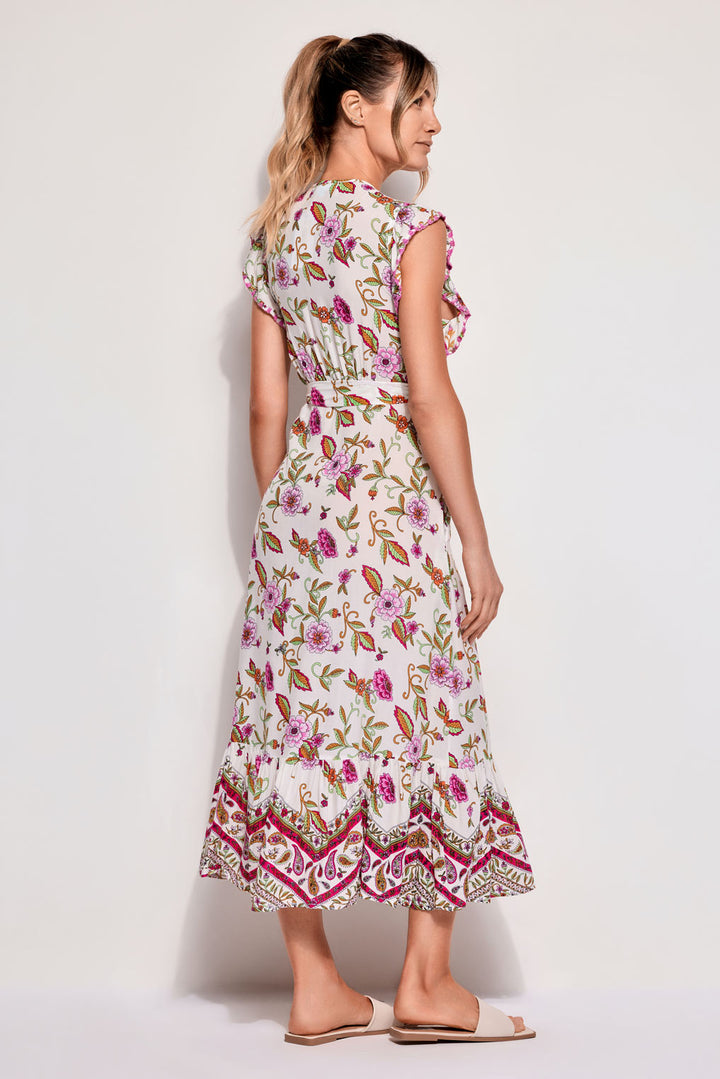 Dress long dress with ruffled sleeves and V-neck, for a sophisticated and delicate look. The pattern floral pattern adds freshness and femininity, while the wrap design offers a comfortable and elegant fit. Perfect for special occasions or summer evenings.