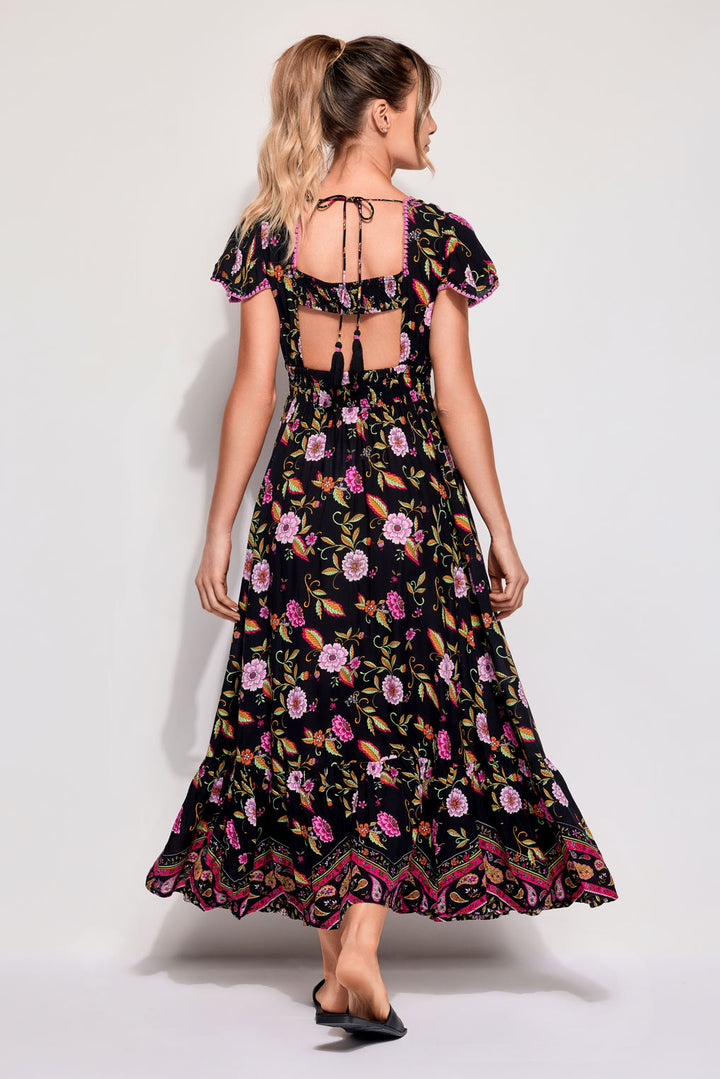 Long dress with ruffled sleeves, perfect for a romantic and feminine look. The drawstring at the waist emphasizes the silhouette, while the V-neck adds a touch of elegance. The vibrant floral pattern brings freshness and brightness, ideal for summer days or casual chic evenings.