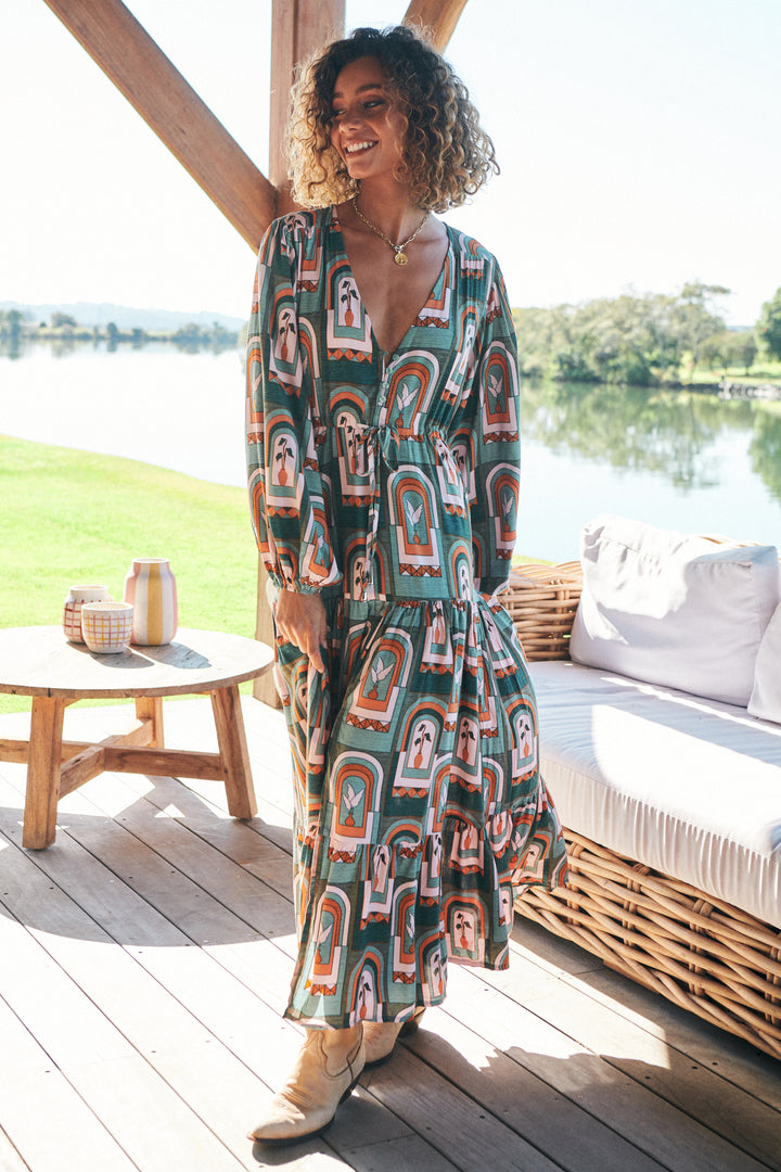 With our "Emerald" long dress, you will be elegant and fashionable. Thanks to the waist waist, you can adjust the dress to your liking. The pattern and the puff sleeve give it a unique look, while the flounced bottom adds a touch of femininity. Perfect for any occasion!