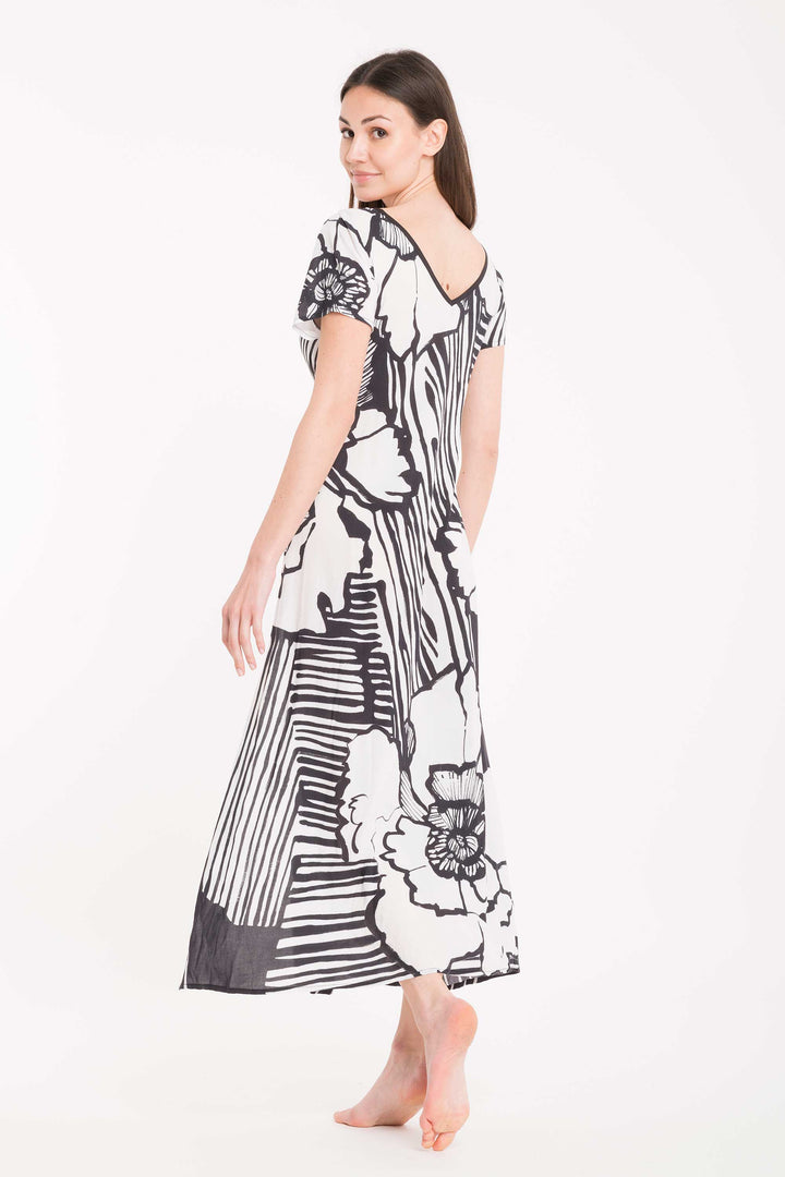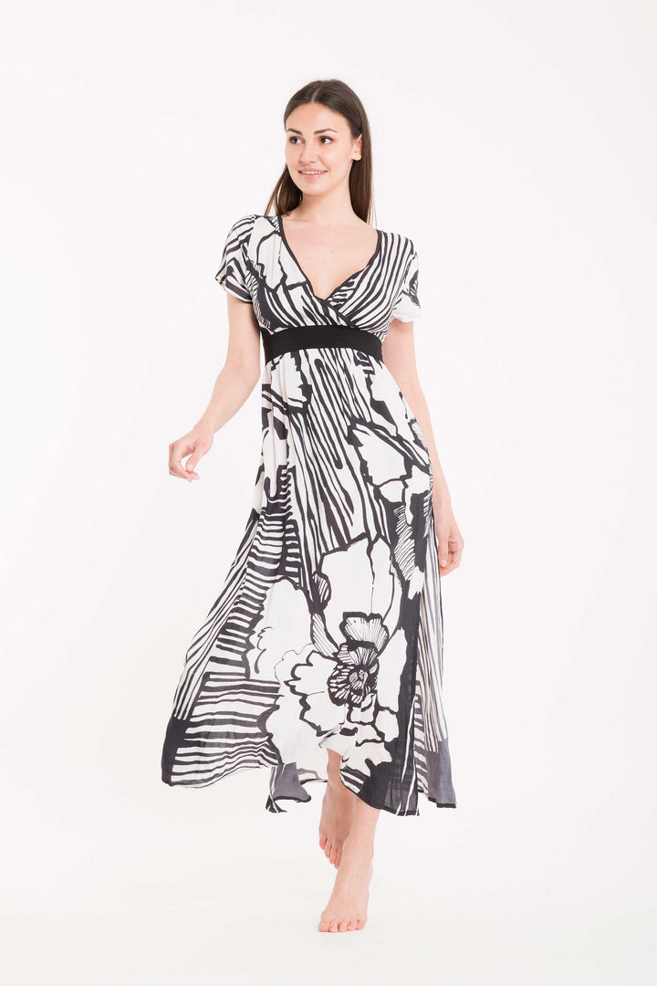 This elegant long Isa dress in floral pattern enhances the silhouette with refined simplicity. The botanical motif gives movement and freshness to the garment, perfect for special occasions or summer evenings. The fluid line and generous neckline create a harmony of proportions, ensuring comfort and elegance without compromise. A versatile piece that stands out for its ability to adapt to different contexts, from casual chic to formal wear.