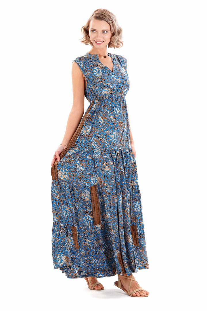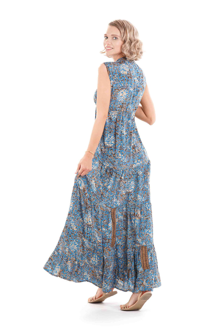 This sleeveless long dress with a charming ethnic pattern captures the essence of artisanal tradition. The fluid and sleeveless design makes it ideal for warm summer days, ensuring freedom of movement and comfort. The ethnic motifs give character and authenticity to the garment, perfect for those seeking a conscious and refined style. A versatile choice that suits multiple occasions, from sunset walks to casual dinners by the sea.