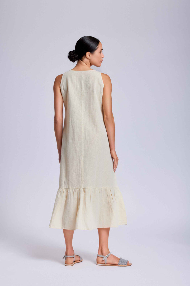 This sleeveless long dress, featuring a ruffled skirt, presents a refined ethnic pattern that enhances its natural elegance. Perfect for those seeking a sophisticated and versatile look, suitable for both casual occasions and more formal events during the warm seasons. The ruffled design creates a fluid and dynamic movement, harmoniously and stylishly enhancing the female silhouette.