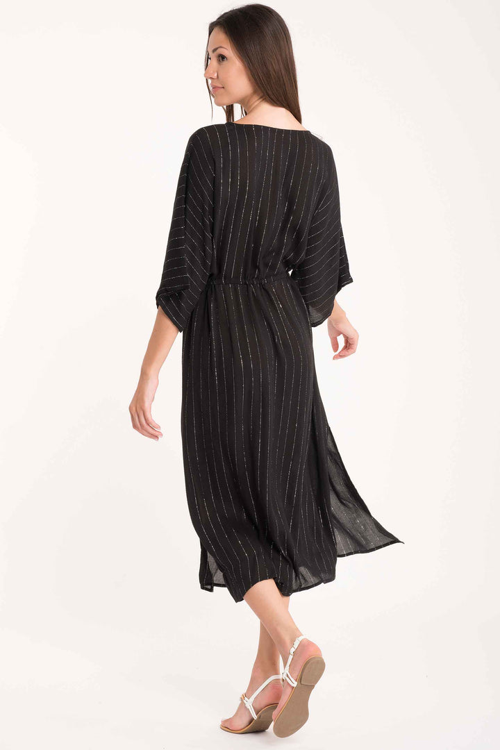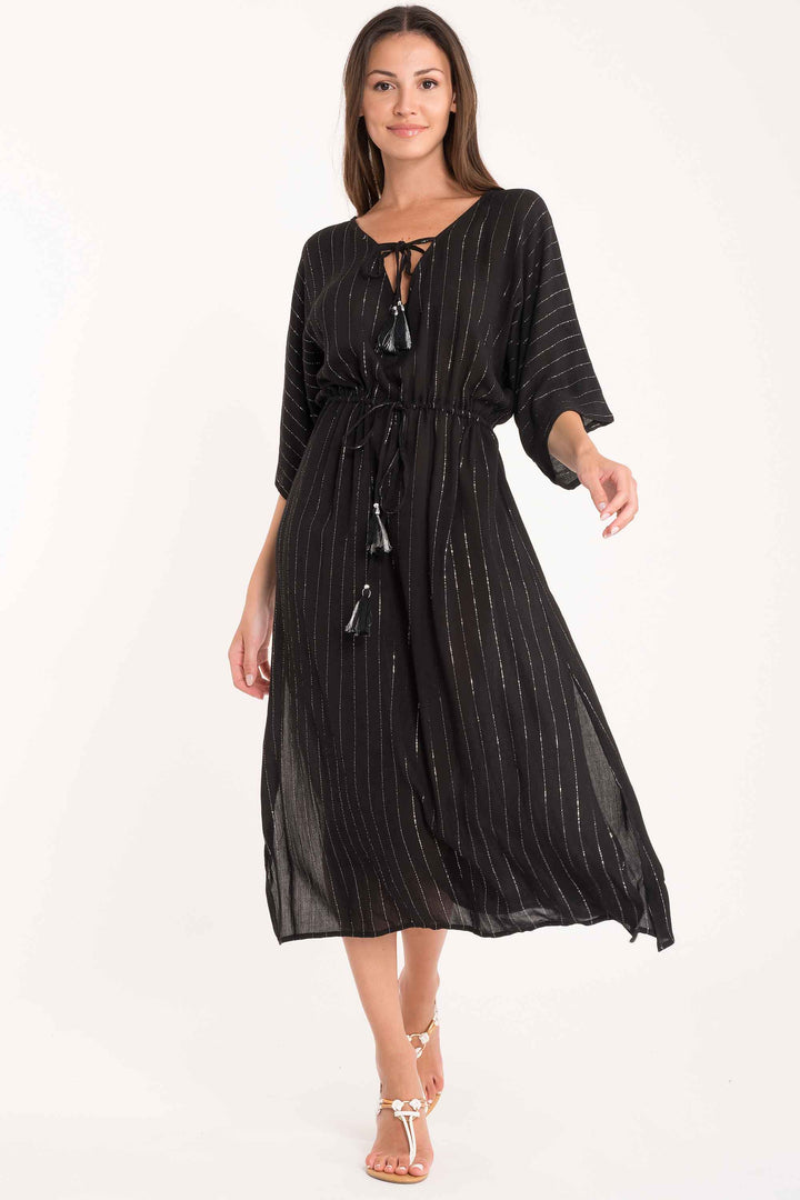The long Valery dress, featuring adjustable ties with refined tassels on the bust and waist, allows a personalized fit that perfectly adapts to your body. The generous side slits ensure freedom of movement without stylistic compromises, creating a fluid and sophisticated silhouette. A versatile piece that effortlessly transitions from the beach to evening events, embodying the casual luxury of the Amalfi Coast.
