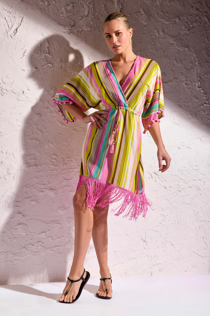 Dress in striped pattern with wide ¾ sleeves that frame the movement. The skirt features fringes that sway elegantly, while the mid-length ensures versatility for every occasion. Perfect for those looking for a garment that combines comfort and contemporary style, ideal to wear from the beach to summer dinner.