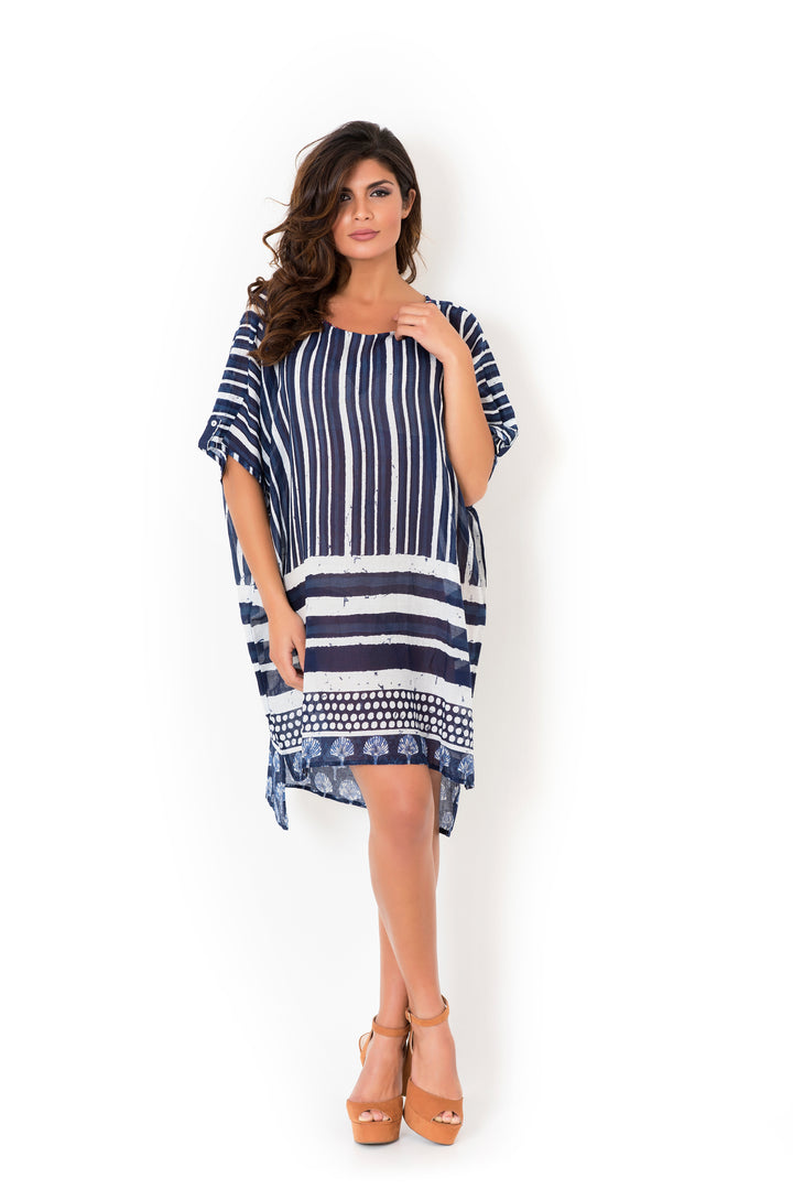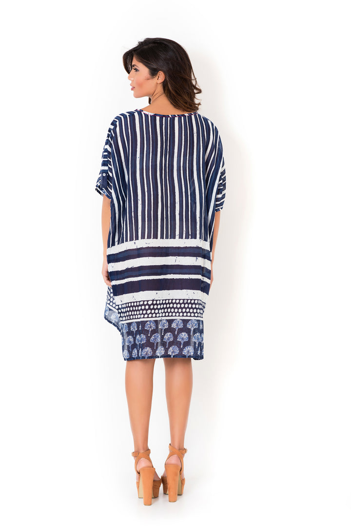 This dress, made of pure cotton, guarantees breathability and comfort all day long. The pattern in shades of blue offers a sophisticated yet versatile look, perfect for both casual and more elegant occasions. The natural fabric and refined design come together to offer a stylish and comfortable choice for your wardrobe.