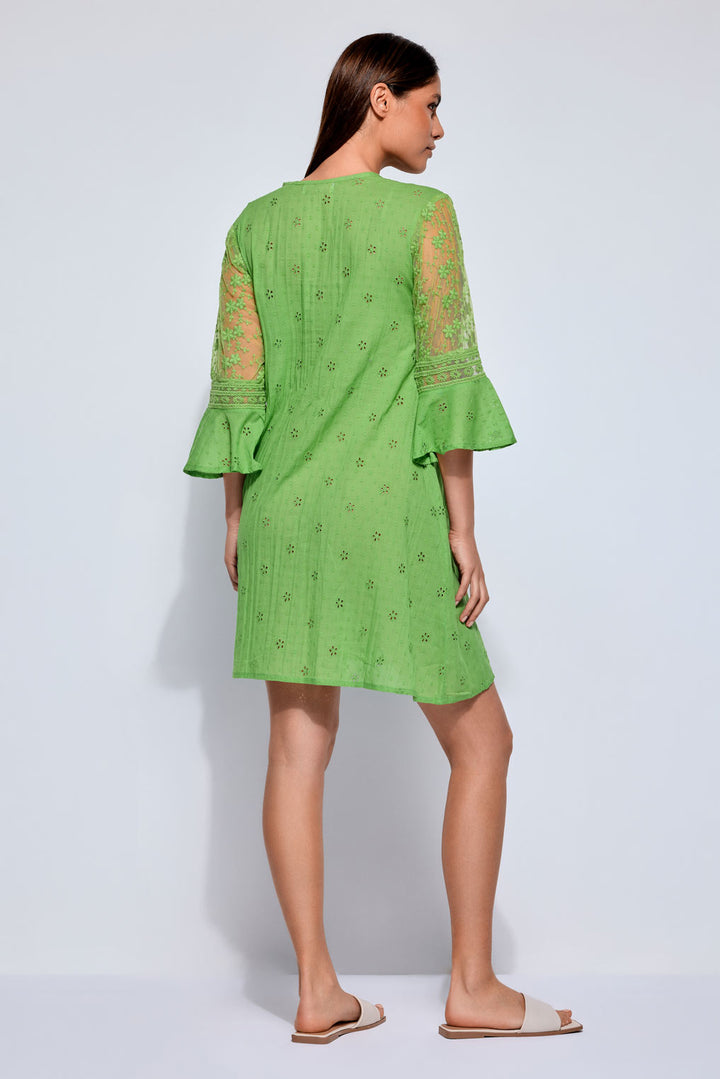 This elegant dress made of fine pure cotton Sangallo lace features a fluid and feminine design. The ¾ sleeves and V-neck add a touch of elegance, while the embroidered pattern and A-line provide a sophisticated look. Perfect for any occasion.