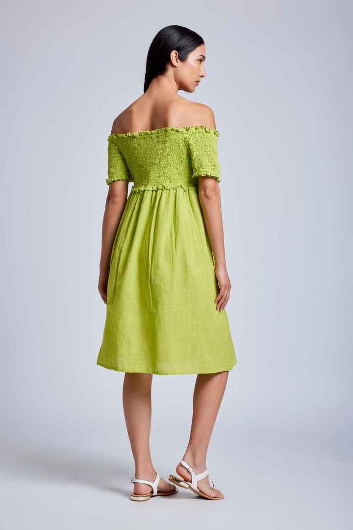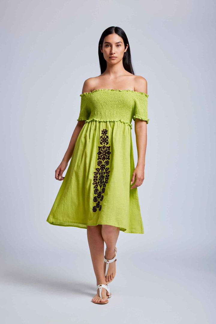 This dress features a boat neckline and a bodice with elastic for an adaptable fit. Made of pure cotton, it offers natural breathability and comfort, perfect for warm weather or layering style. Its simple yet refined design makes it a versatile addition to your wardrobe.