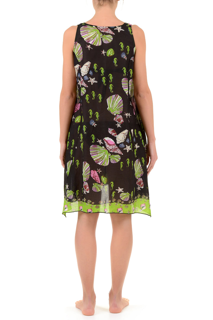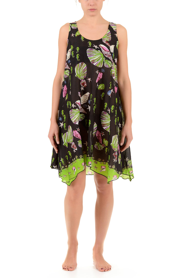 The sleeveless Alba dress in pure cotton is perfect for summer days at the beach. The round neckline guarantees comfort and versatility, while the pattern with seahorses and shells captures the essence of the Amalfi coast. The fabric ensures breathability and softness on the skin, ideal for those seeking quality and style without compromise. An essential garment that combines practicality and refinement.
