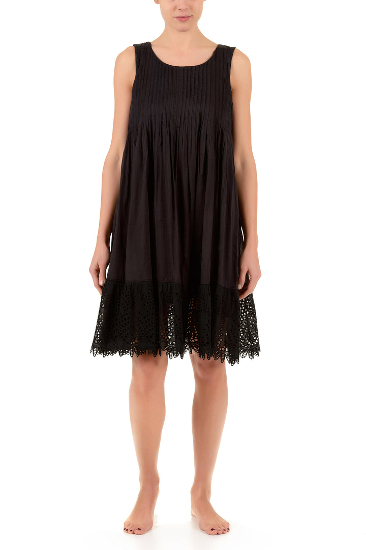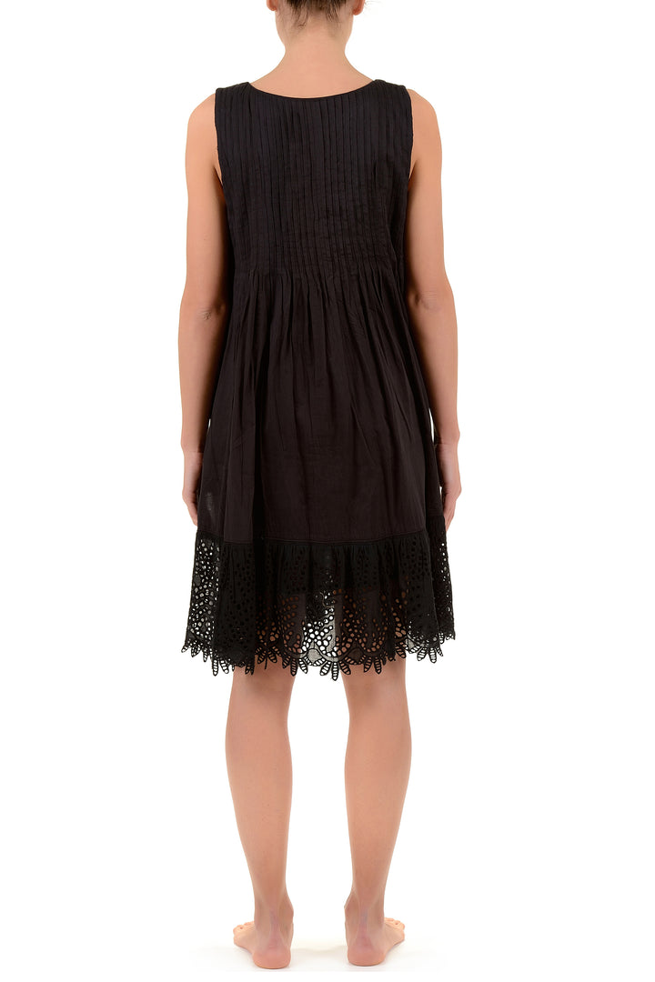 This sleeveless black dress is made of pure cotton, ensuring a soft feeling ideal for the hottest days. The delicate lace inserts on the hem add a touch of elegance and refinement, balancing simplicity with refined details. Perfect for those seeking comfort without sacrificing style.