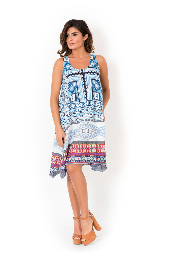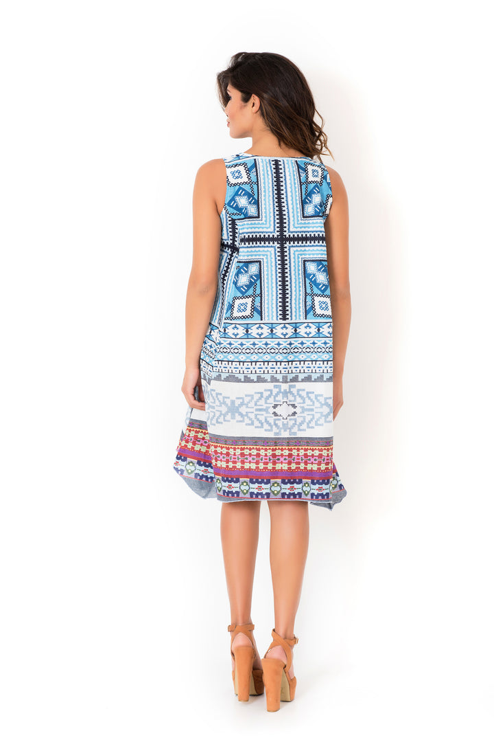This sleeveless dress features a classic round neckline and is made of pure cotton, ensuring breathability and comfort. The ethnic-inspired pattern adds a unique and fashionable touch, making it an ideal choice for warm days and casual outings. The simple yet elegant design allows for multiple pairings, always maintaining a refined look.