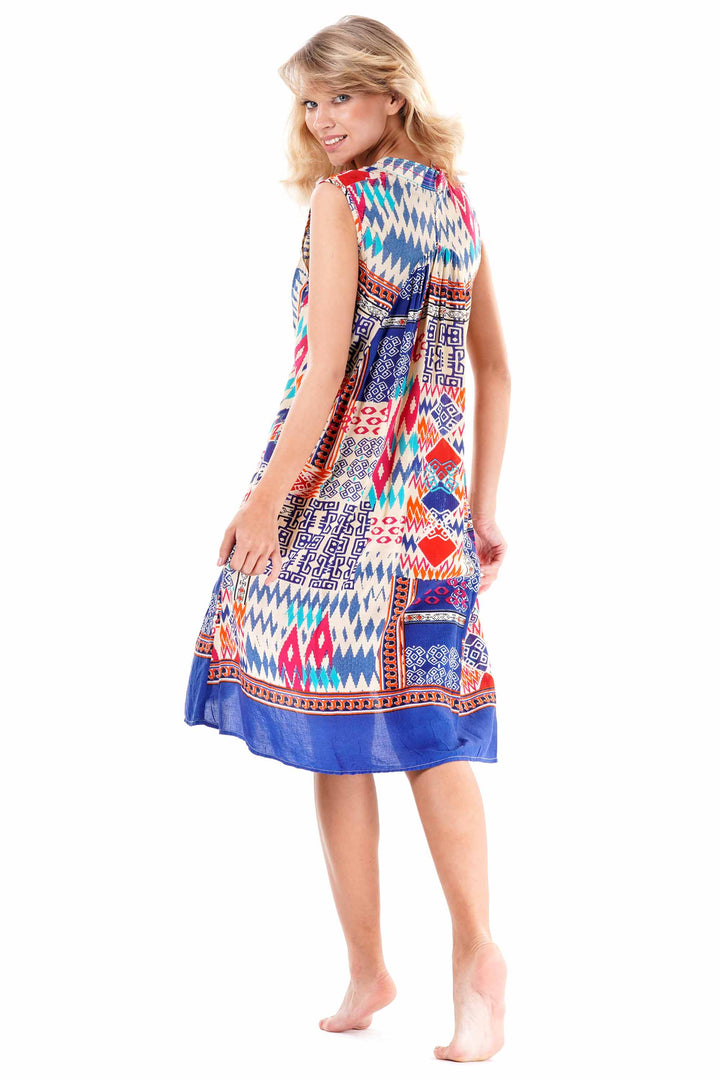 This elegant sleeveless dress with a V-neck enhances the silhouette with refined lines. The ethnic pattern gives character and personality to the garment, making it ideal for those seeking a conscious and sophisticated style. Perfect for casual-chic occasions, it stands out for its versatility and ability to adapt to different contexts, from day to evening.