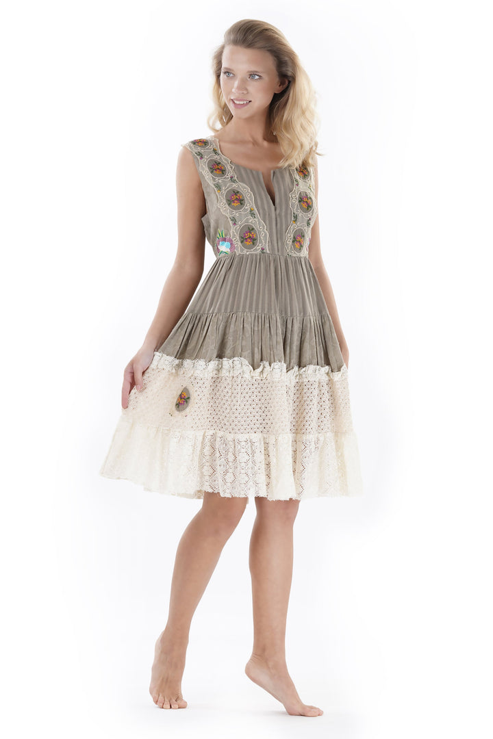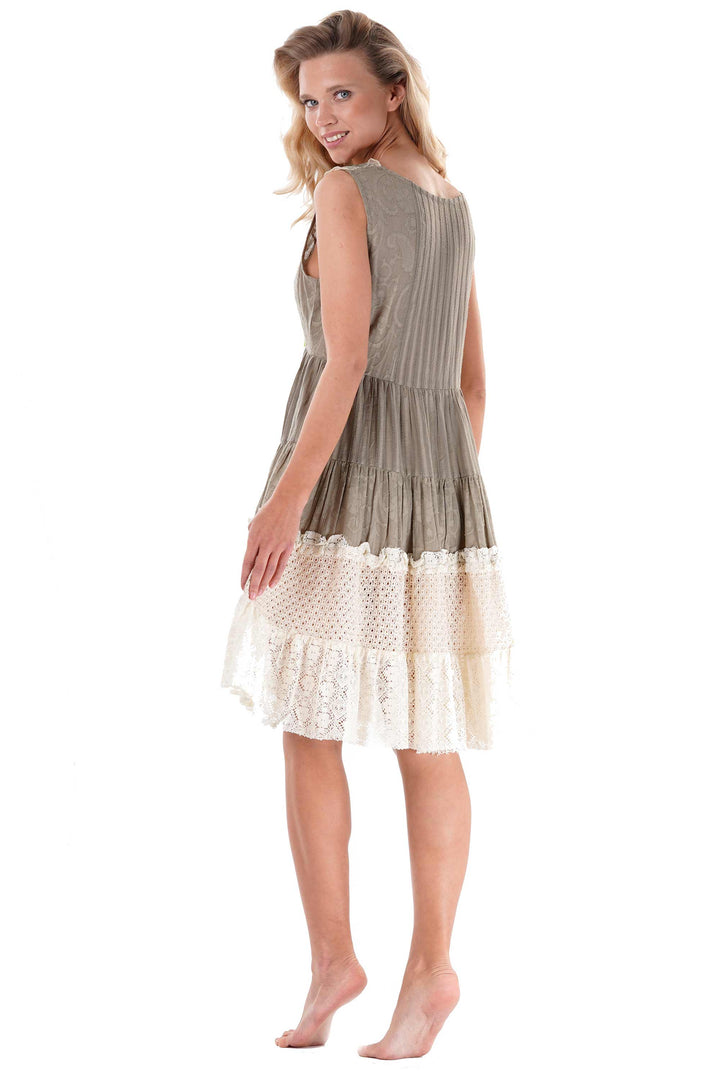 This sleeveless dress features a wide ruffled skirt made of lightweight linen, ensuring breathability and comfort. Delicate lace embroidery adds a refined texture and an elegant detail, making it a sophisticated choice for summer occasions. The combination of natural fabric and subtle embellishments reflects expert tailoring, with attention to both style and practicality.