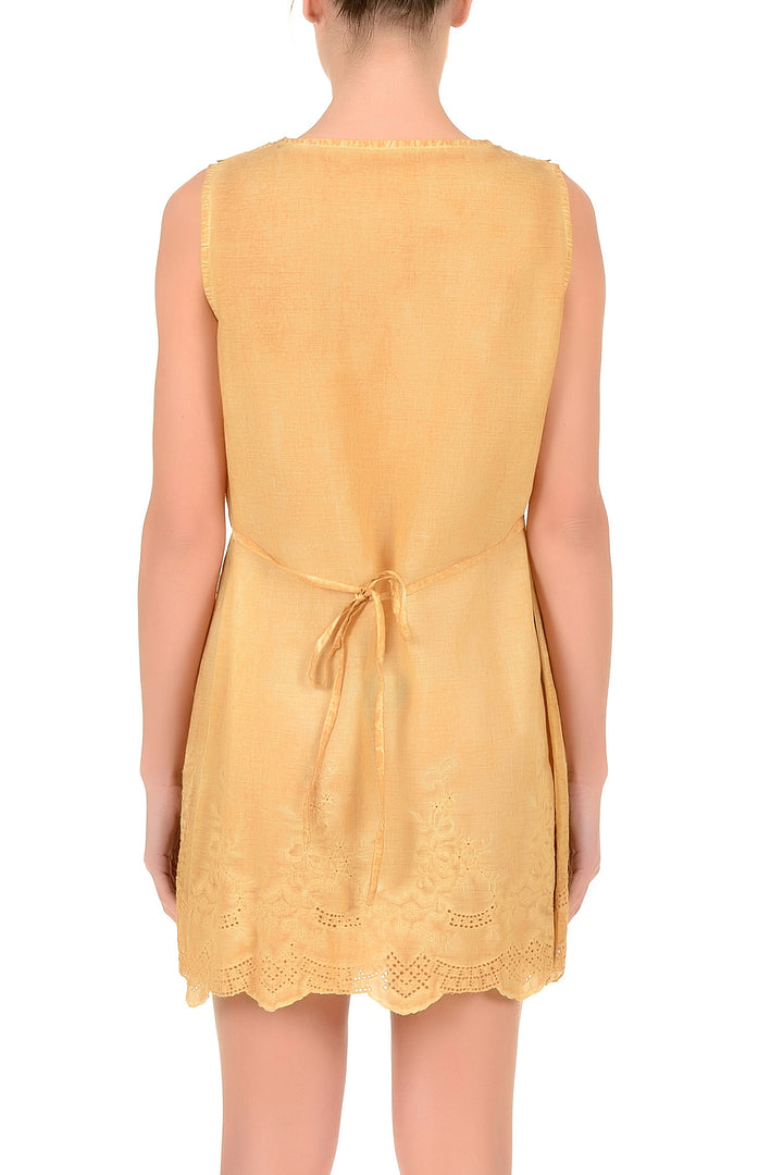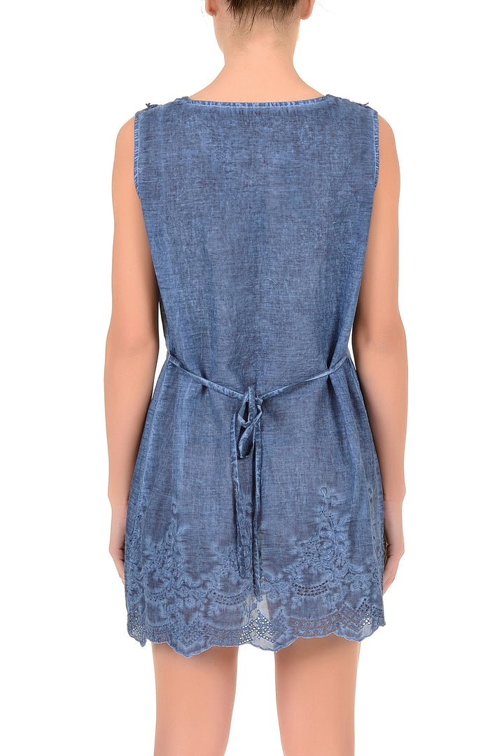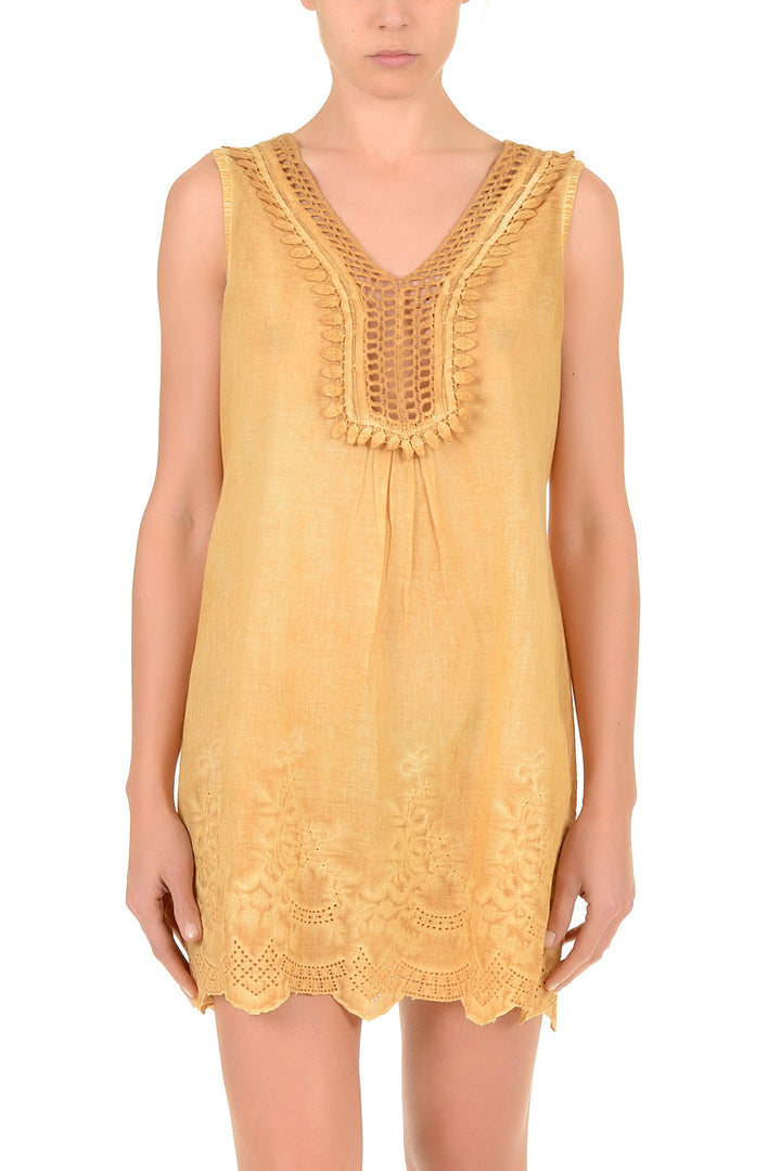 This sleeveless dress made of pure cotton is ideal for the summer season. The fabric ensures breathability and comfort during the hottest days, allowing optimal air circulation. The sleeveless silhouette offers freedom of movement and stylistic versatility, perfectly adapting to casual and semi-formal occasions. The quality of the cotton guarantees durability over time and ease of maintenance. An essential garment that combines practicality and timeless elegance.