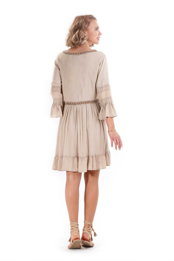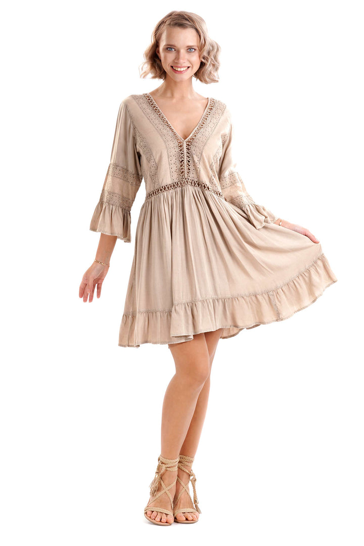 This elegant dress features a flattering V-neckline and a flowing ruffled skirt, designed to enhance movement and add a touch of sophistication. Perfect for both casual and formal occasions, its structured silhouette balances modern style and timeless charm.