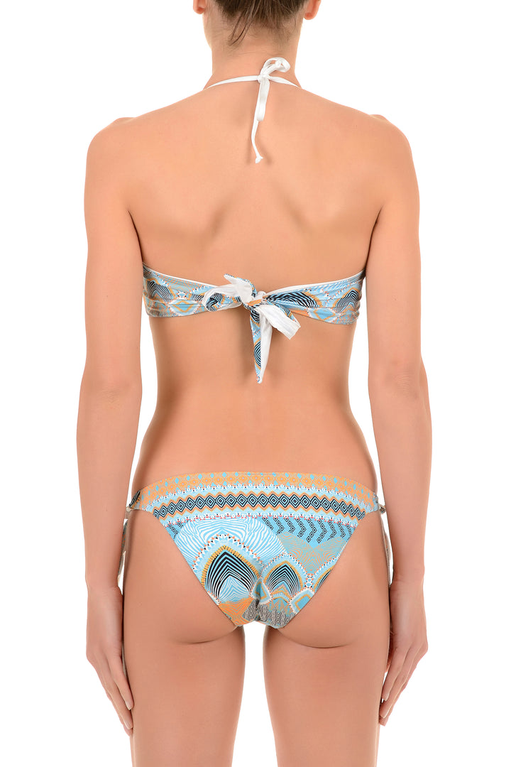 This bandeau bikini with bow details captures the essence of bohemian style. The bandeau model offers a charming silhouette and comfortable support, while the ethnic pattern gives a sophisticated and refined touch. Perfect for those who want to stand out on the beach with a piece that combines femininity and character. A versatile option that suits different body types, ideal for women who appreciate conscious design and careful details.